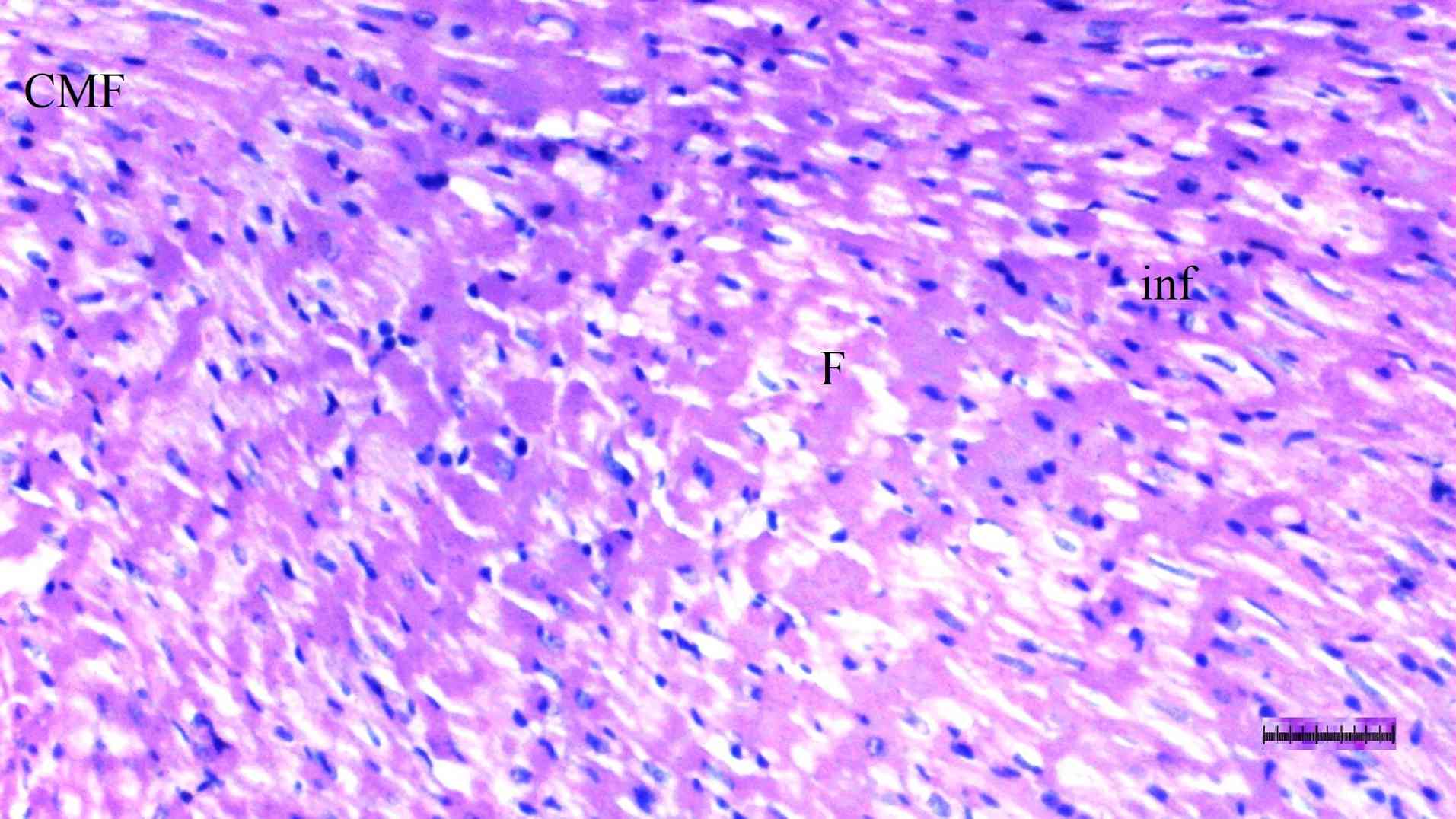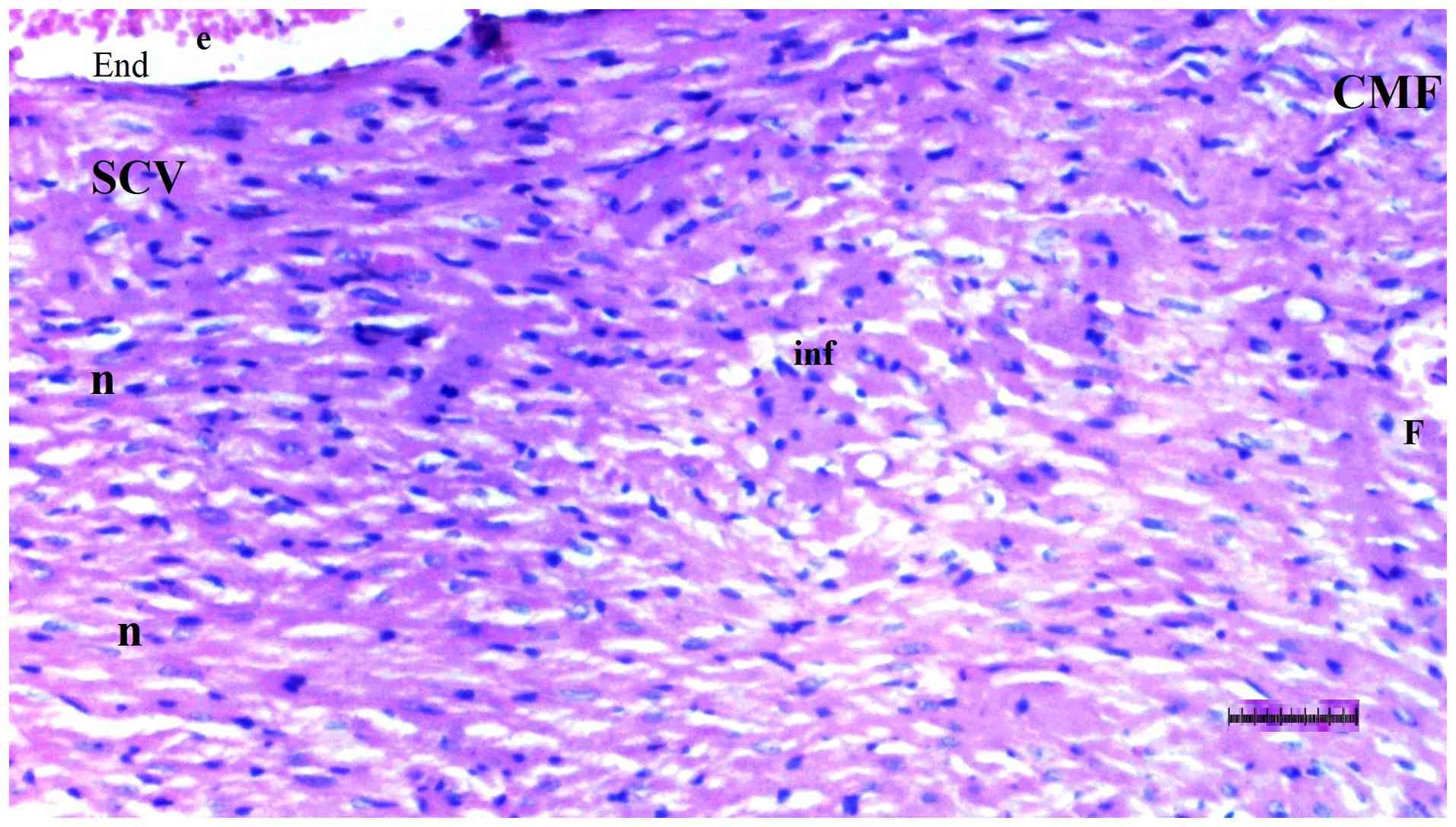 Mononuclear (MN) cell infiltration in the parenchyma was significantly different among groups (P=0.035). MN cell infiltration was more pronounced in the DM/SEP and FUL/C-60 groups compared with the S group (P=0.004 and P=0.040, respectively) (Table I; Fig. 1, Fig. 2, Fig. 3 and Fig. 4).