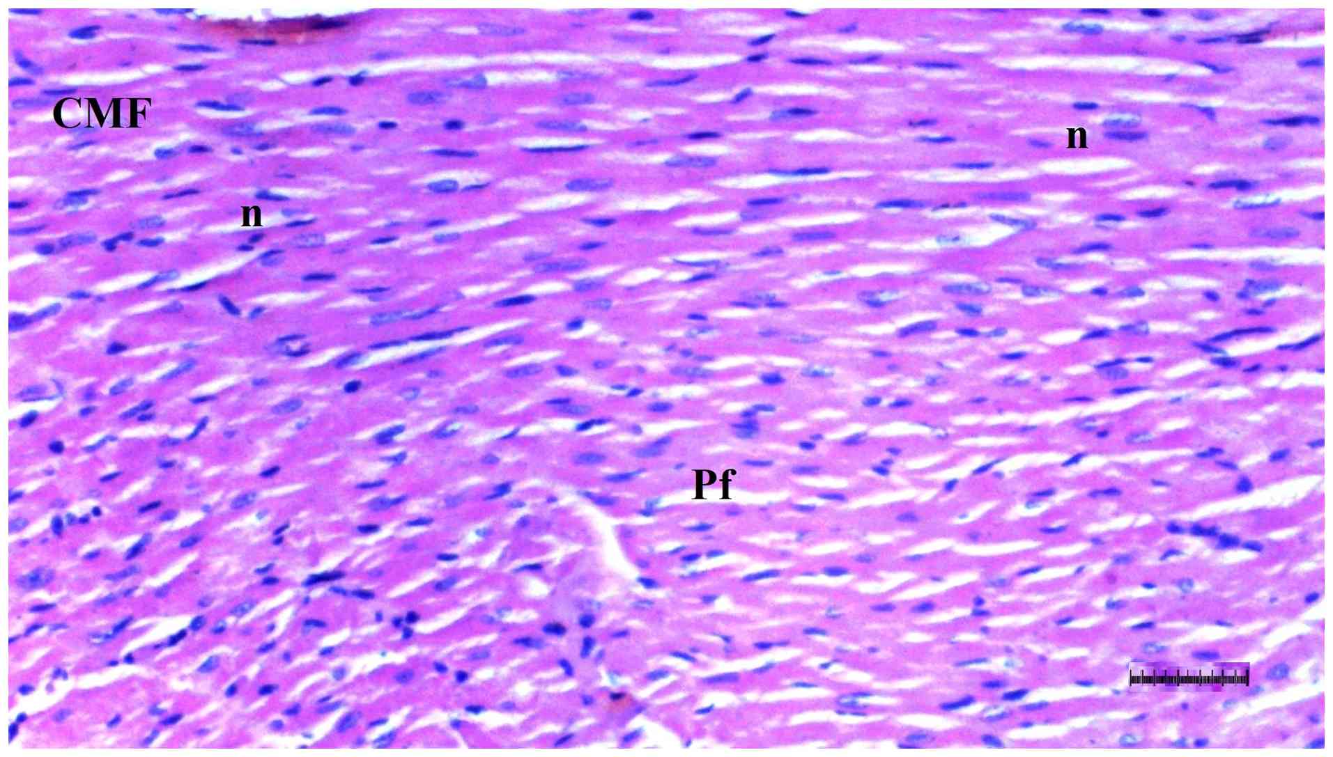 Sepsis not only affects the liver but also negatively impacts cardiac tissue. In the present study, cardiac oxidative stress markers (such as TBARS and CAT) and inflammatory mediators were not assessed in heart tissue. However, histopathological findings showed that myocardial disorganization and interstitial fibrosis were more pronounced in the DM/SEP group compared with the other groups, indicating the detrimental cardiac effects of sepsis in patients with diabetic. Sepsis triggers a complex interplay of immune activation, oxidative stress, mitochondrial failure and cardiomyocyte apoptosis, resulting in myocardial disorganization and disruption of cardiomyocyte architecture and functional impairment. By contrast, interstitial fibrosis stiffens the tissue, thereby compromising cardiac performance (47). Similar to the findings of Injac et al (42), the present study showed a decrease in pathological changes in heart tissue in the FUL/C-60 group, suggesting that fullerenol C60 exhibited cardioprotective effects and alleviated sepsis-induced cardiotoxicity. The antioxidant and anti-inflammatory actions of fullerenol C60 may represent the underlying mechanisms of this protective effect.