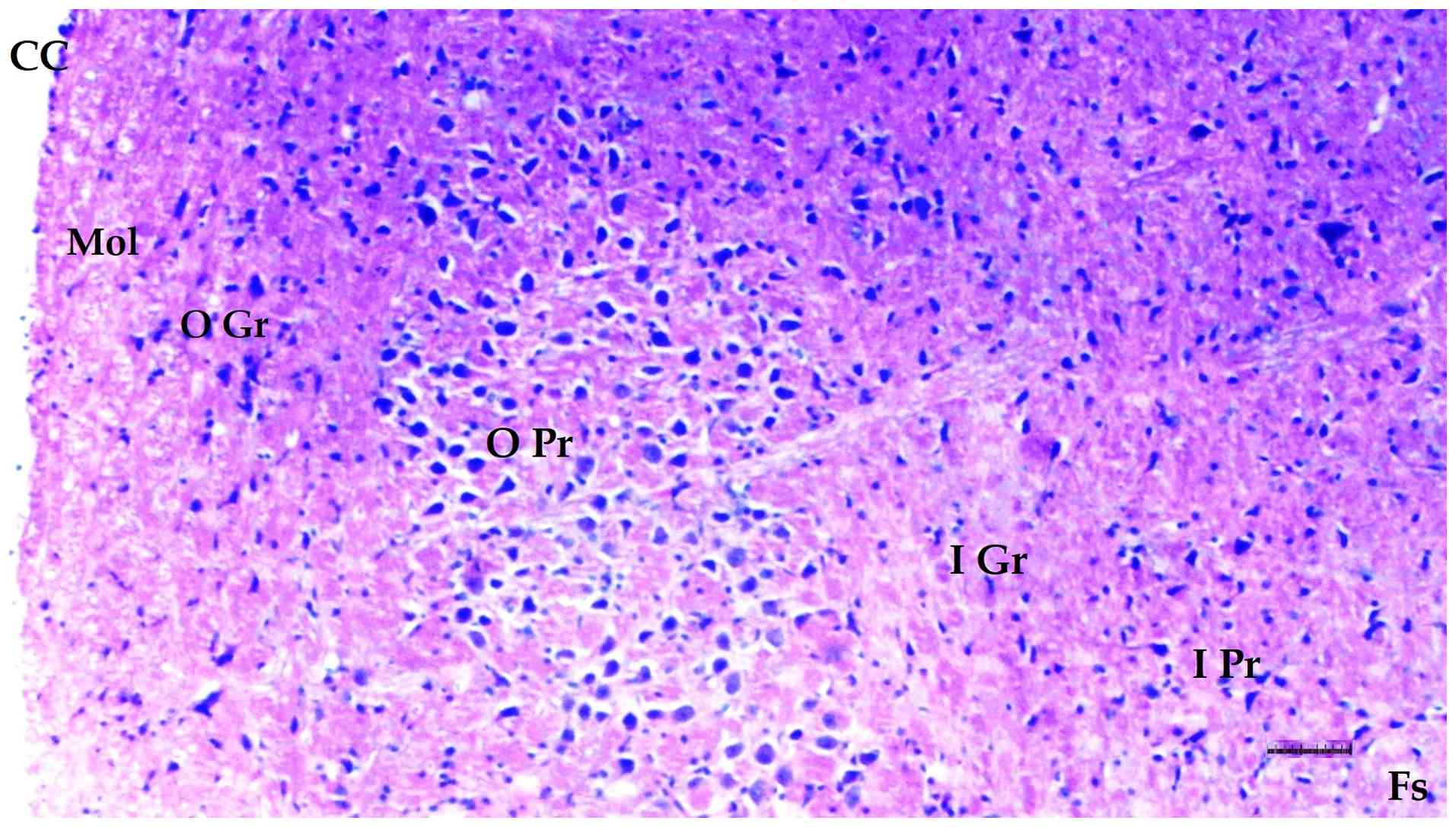 Table IIIHistopathological findings of the S group (n=6), D group (n=8), DM/SEP group (n=8) and FUL/C-60 group (n=8) in in brain-cerebellar tissue. |