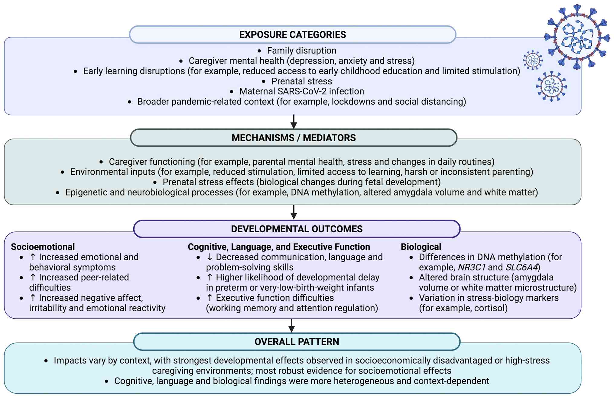 Overall, pandemic-related disruptions may have amplified existing inequities in early childhood development, with the most notable impacts concentrated among children facing socioeconomic disadvantage and caregiver distress. Therefore, moving from preliminary associations to actionable knowledge may require coordinated, longitudinal and multi-modal research, coupled with policies that protect early-education access and support caregiver wellbeing.