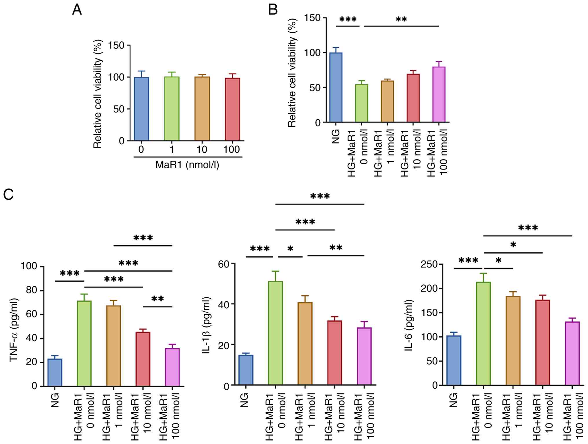 As shown in Fig. 1A, MaR1 treatment at 1, 10 and 100 nmol/l did not significantly affect the viability of ARPE-19 cells under control conditions. However, under HG conditions, cell viability dropped significantly. By contrast, MaR1 reversed this viability reduction in a dose-dependent manner (Fig. 1B). ELISA assays revealed higher TNF-α, IL-1β and IL-6 levels in the supernatant of HG-exposed cells compared with those in the NG group. MaR1 treatment significantly mitigated the secretion of these inflammatory factors. Specifically, the 100 nmol/l dose exhibited the most potent anti-inflammatory effect, significantly suppressing cytokine levels compared with the lower doses (1 and 10 nmol/l), indicating a dose-dependent inhibition (Fig. 1C).