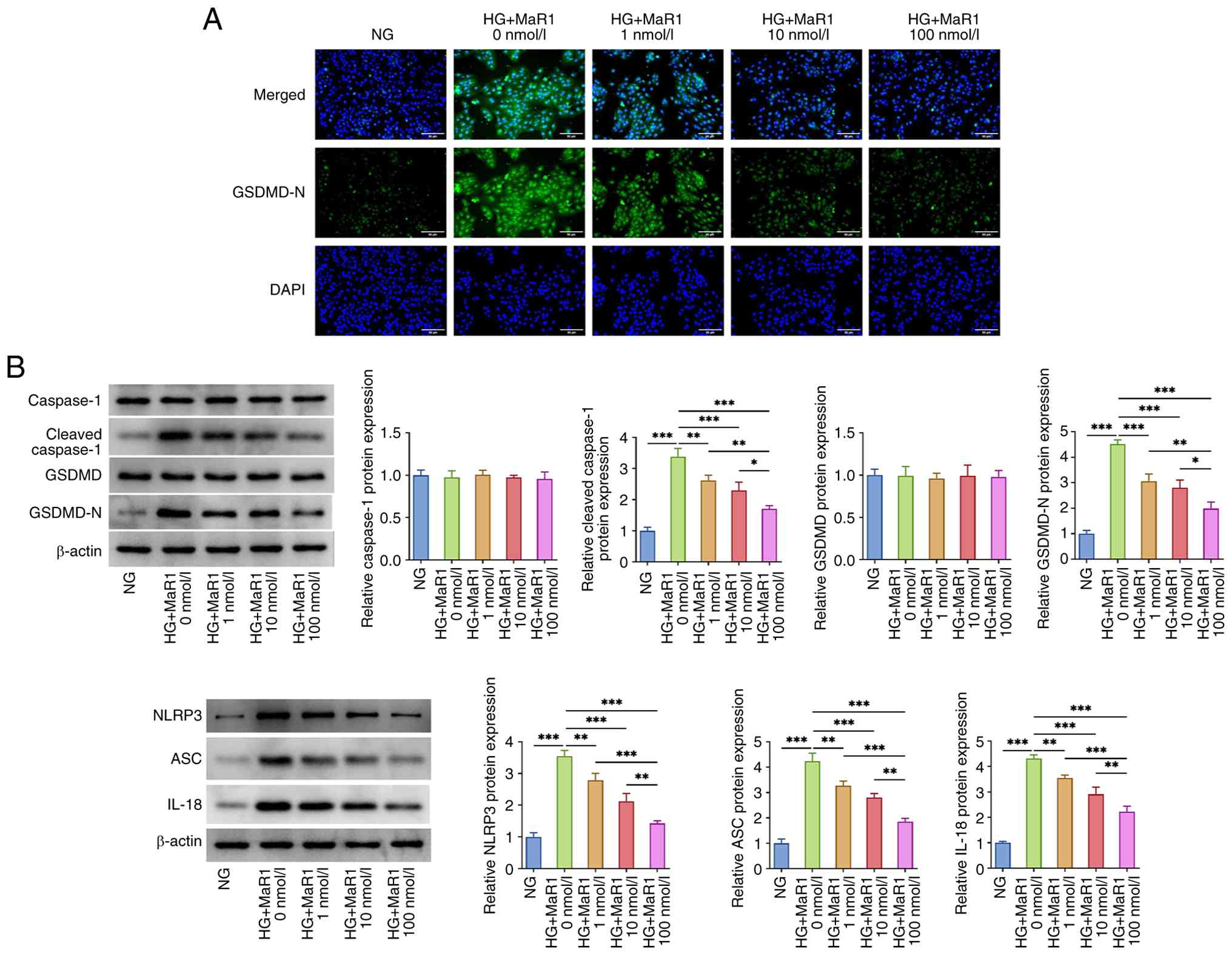 Immunofluorescence staining revealed that the expression of the pyroptosis marker GSDMD-N increased following HG exposure, as assessed through fluorescence intensity (Fig. 2A). However, MaR1 treatment significantly reduced this HG-induced fluorescence intensity. Western blotting further demonstrated that caspase-1 and GSDMD expression displayed no significant changes across different treatment groups. By contrast, ARPE-19 cells in the HG group exhibited markedly higher levels of GSDMD-N, cleaved caspase-1, NLRP3, ASC and IL-18 compared with those in the NG group (Fig. 2B). Crucially, MaR1 treatment reversed the upregulation of these pyroptosis-related proteins. These findings suggested that HG stimulation induced pyroptosis in ARPE-19 cells and that MaR1 dose-dependently inhibited the HG-induced increase in the expression of pyroptosis-related proteins.