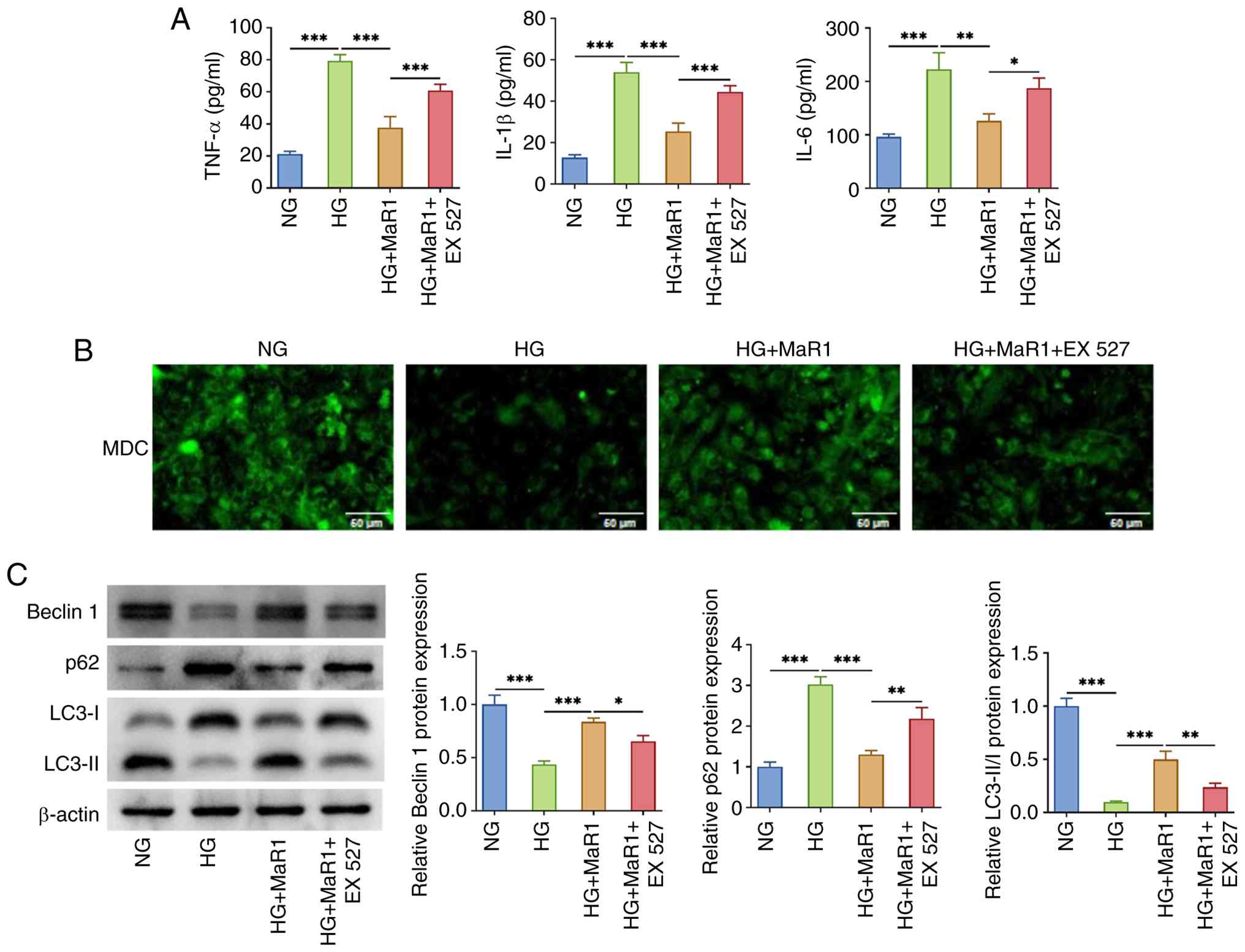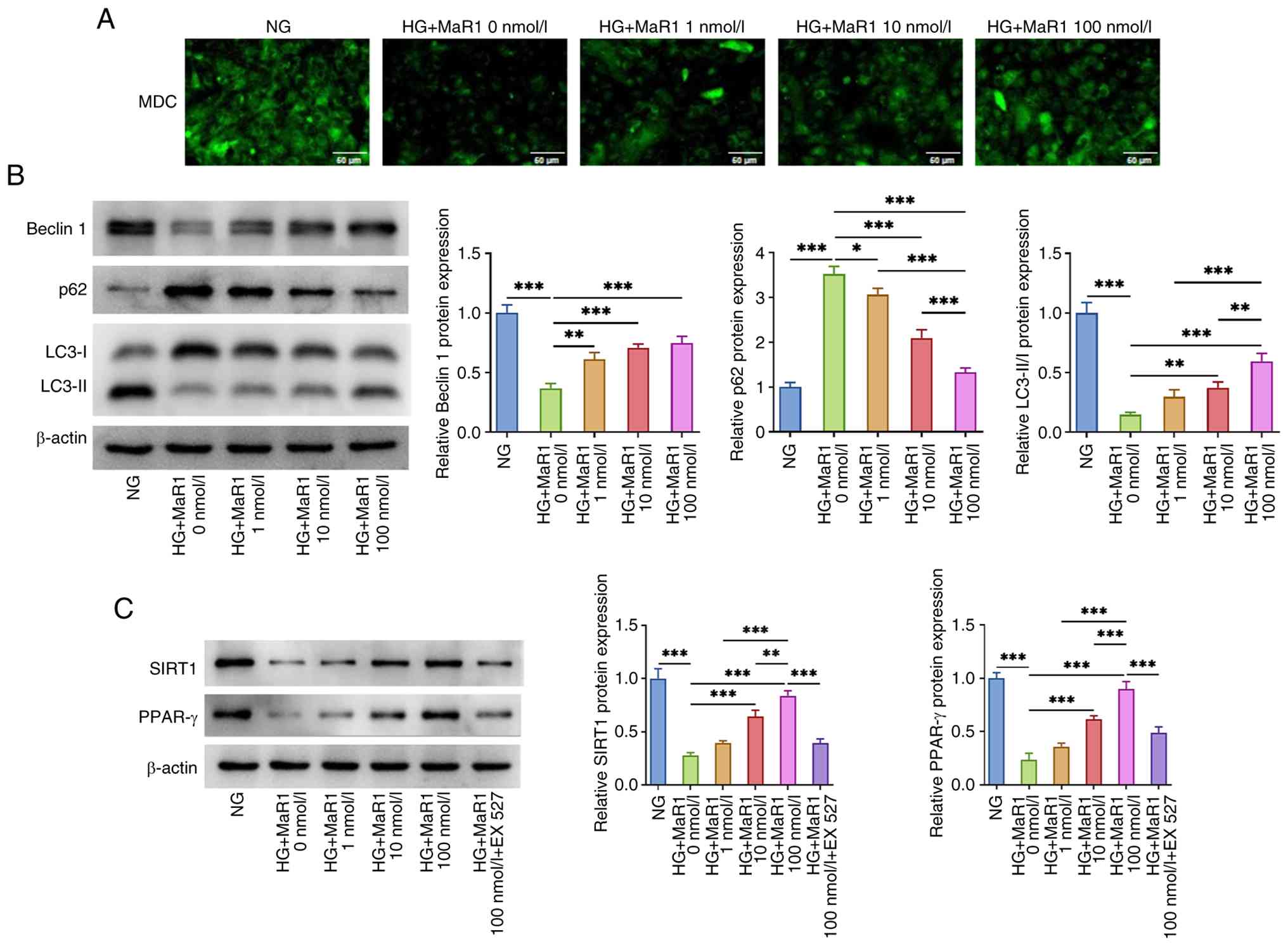 Following the guidance of previous literature, ARPE-19 cells were pretreated with MaR1 (cat. no. HY-116429; MedChemExpress), dissolved in dimethyl sulfoxide (DMSO), at concentrations of 1, 10 and 100 nmol/l for 30 min at 37˚C before HG exposure for 24 h (22-24). To investigate the role of autophagy and sirtuin 1 (SIRT1)/peroxisome proliferator-activated receptor-γ (PPAR-γ) signaling, ARPE-19 cells were treated with 10 µM of the SIRT1 inhibitor selisistat (EX527; C13H13ClN2O; cat. no. HY-15452; MedChemExpress) or 2.5 µM of the autophagy inhibitor 3-methyladenine (3-MA; C6H7N5; cat. no. HY-19312; MedChemExpress), both dissolved in DMSO, for 2 h at 37˚C before HG exposure. The dose and duration of EX527 and 3-MA administration were determined in relation to previous studies (25,26).