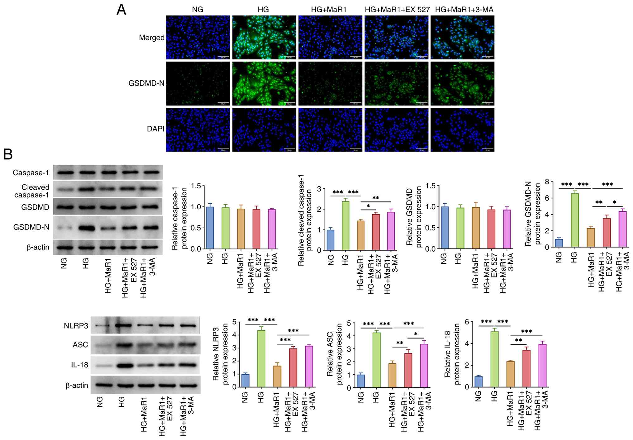 To further examine how SIRT1/PPAR-γ signaling-mediated autophagy is associated with the effects of MaR1, ARPE-19 cells were pretreated with the SIRT1 inhibitor EX527. Additionally, to rigorously confirm the specific involvement of the autophagy pathway in MaR1-mediated protection, the autophagy inhibitor 3-MA was used before subjecting the cells to HG. The findings showed that MaR1 markedly decreased GSDMD-N fluorescence intensity in ARPE-19 cells (Fig. 5A) and reduced the expression levels of GSDMD-N, cleaved caspase-1, NLRP3, ASC and IL-18 compared with those in the HG group (Fig. 5B). However, both EX527 and 3-MA significantly reversed the protective effects of MaR1, leading to the re-elevation of these pyroptosis-related markers. Notably, the 3-MA treatment resulted in significantly higher protein expression levels compared with the EX527 treatment, suggesting that direct autophagy inhibition had a more pronounced effect on blocking MaR1 activity than SIRT1 inhibition in this context.