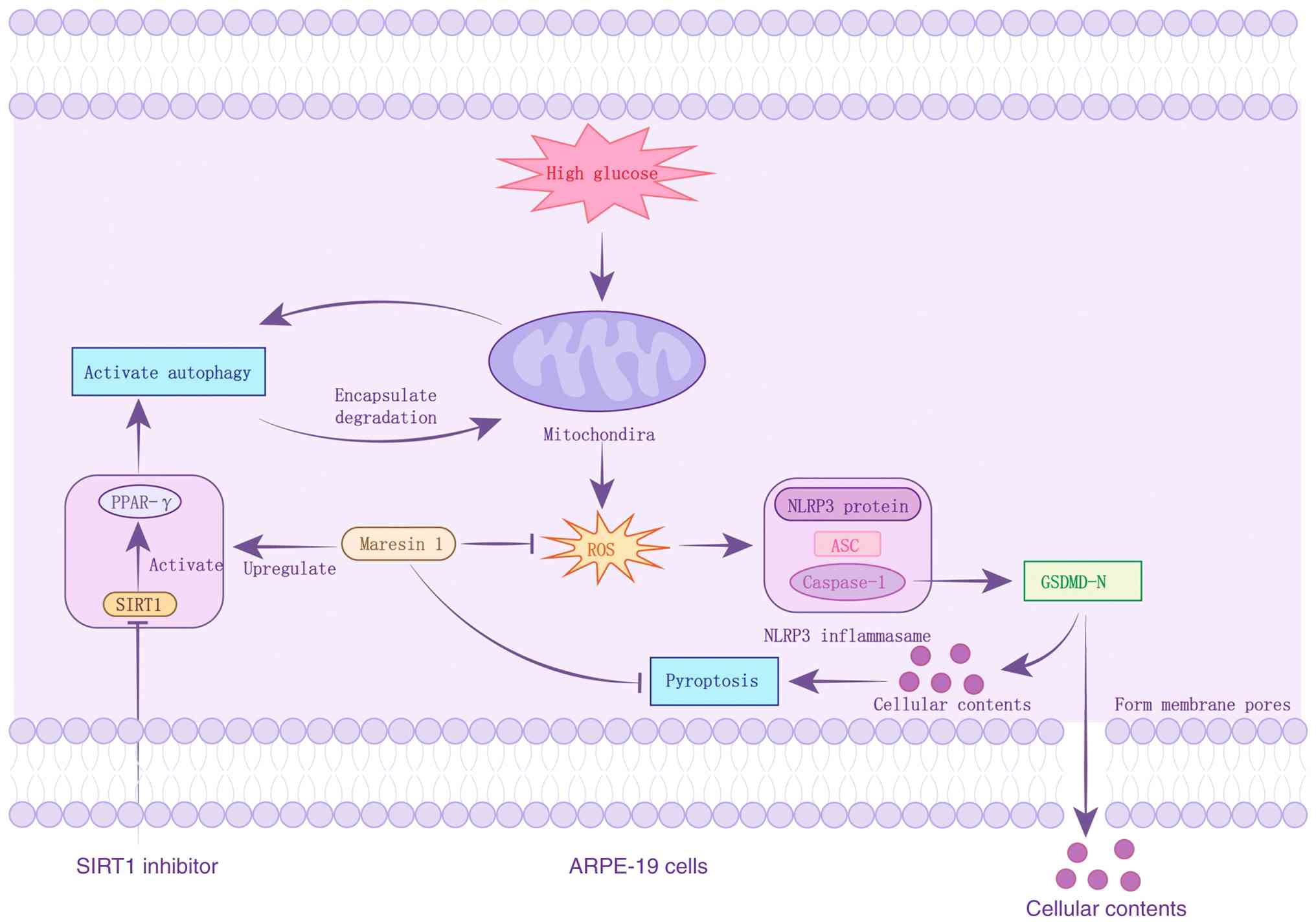 The present study demonstrated that MaR1 restored autophagy, potentially by upregulating the SIRT1/PPAR-γ signaling pathway, thereby effectively attenuating HG-induced pyroptosis and inflammatory responses in ARPE-19 cells (Fig. 6). However, a limitation of the present study is that the experiments were conducted using ARPE-19 cells. In vitro cell models offer advantages, such as easy control of experimental conditions and relatively simple operation, facilitating the investigation of intracellular molecular mechanisms and signaling pathways. However, notable differences exist between in vitro cell models and the complex physiological environment observed in vivo. Cells in vivo are influenced by numerous factors, including cell-cell interactions, the tissue microenvironment and systemic metabolic status, which are difficult to fully simulate through in vitro models.