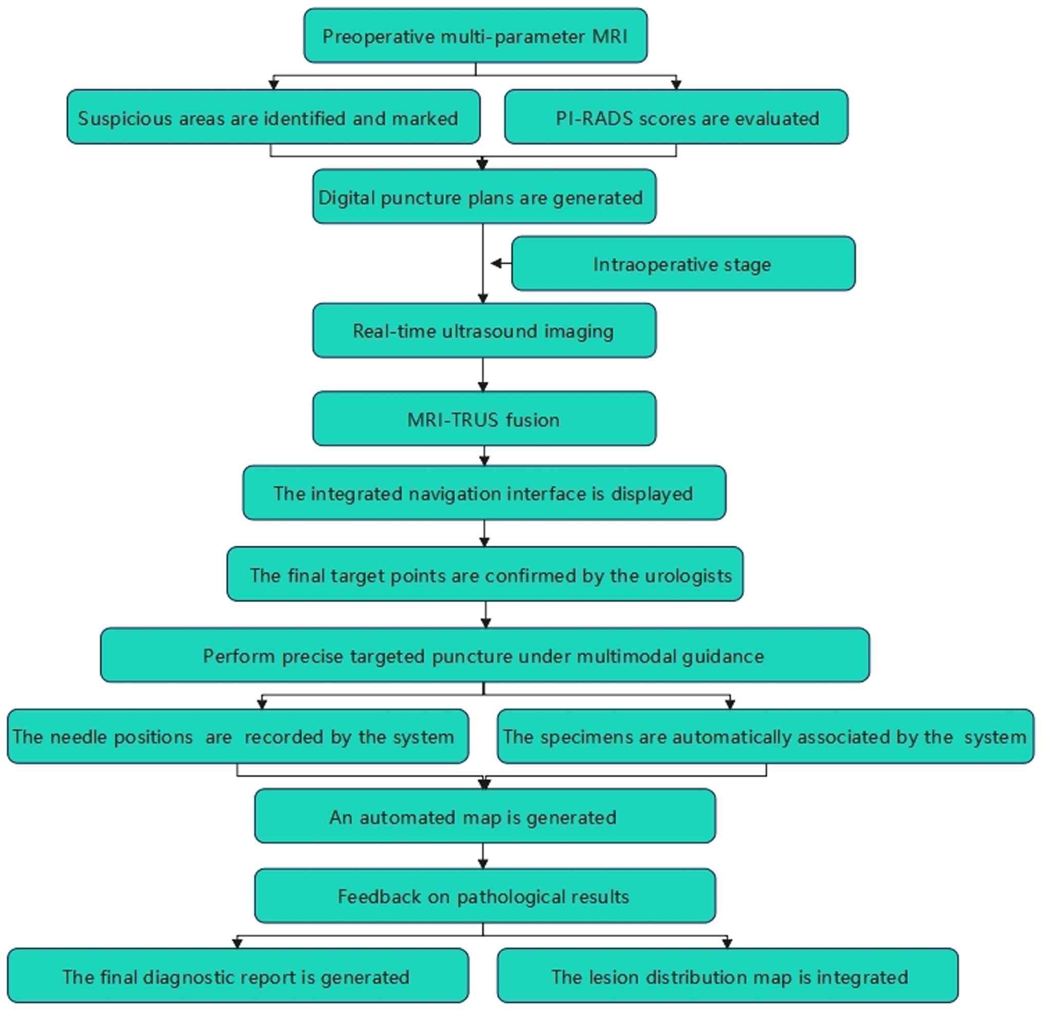 Multiple MRI-TRUS software integration-guided targeted prostate biopsy involves storing prostate MRI image data in specialized equipment that is fused with intraoperative real-time ultrasound images. This fusion is achieved automatically and intelligently by the machines, clearly identifying the target area, tracking the TRUS probe and determining the optimal puncture biopsy path (45). This approach reduces the reliance on the ability of the puncture physician to interpret films. The combination of precise positioning from prostate MRI with real-time ultrasound imaging technology meets the requirements for accurately locating and tracking prostate lesion sites. This technology notably enhances the ability to identify prostate lesions during procedures and improves the accuracy of PCa punctures (46).