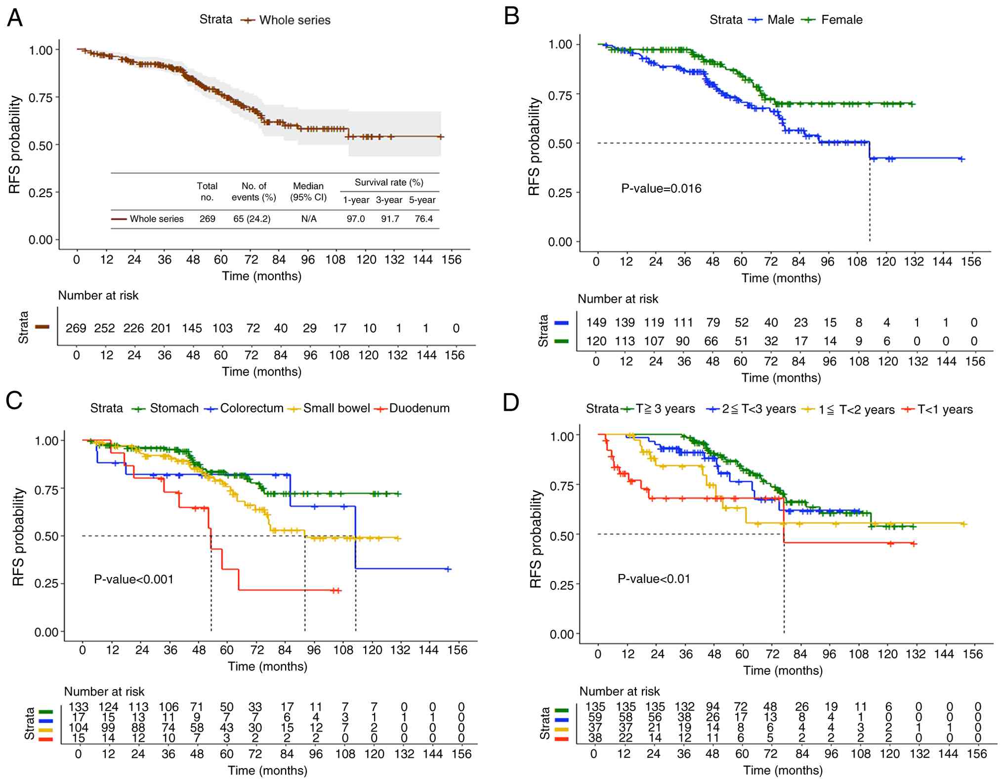 Table IV presents the univariate Cox regression analysis. Significant factors associated with unfavorable RFS were male sex [hazard ratio (HR): 1.89, 95% CI: 1.12-3.21, P=0.018] and treatment duration <1 year (HR: 3.03, 95% CI: 1.52-6.05, P=0.002), and the tumor locations with the highest risk were the duodenum (HR: 4.68, 95% CI: 2.14-10.24, P<0.001) and small bowel (HR: 1.75, 95% CI: 1.01-3.06, P=0.049).