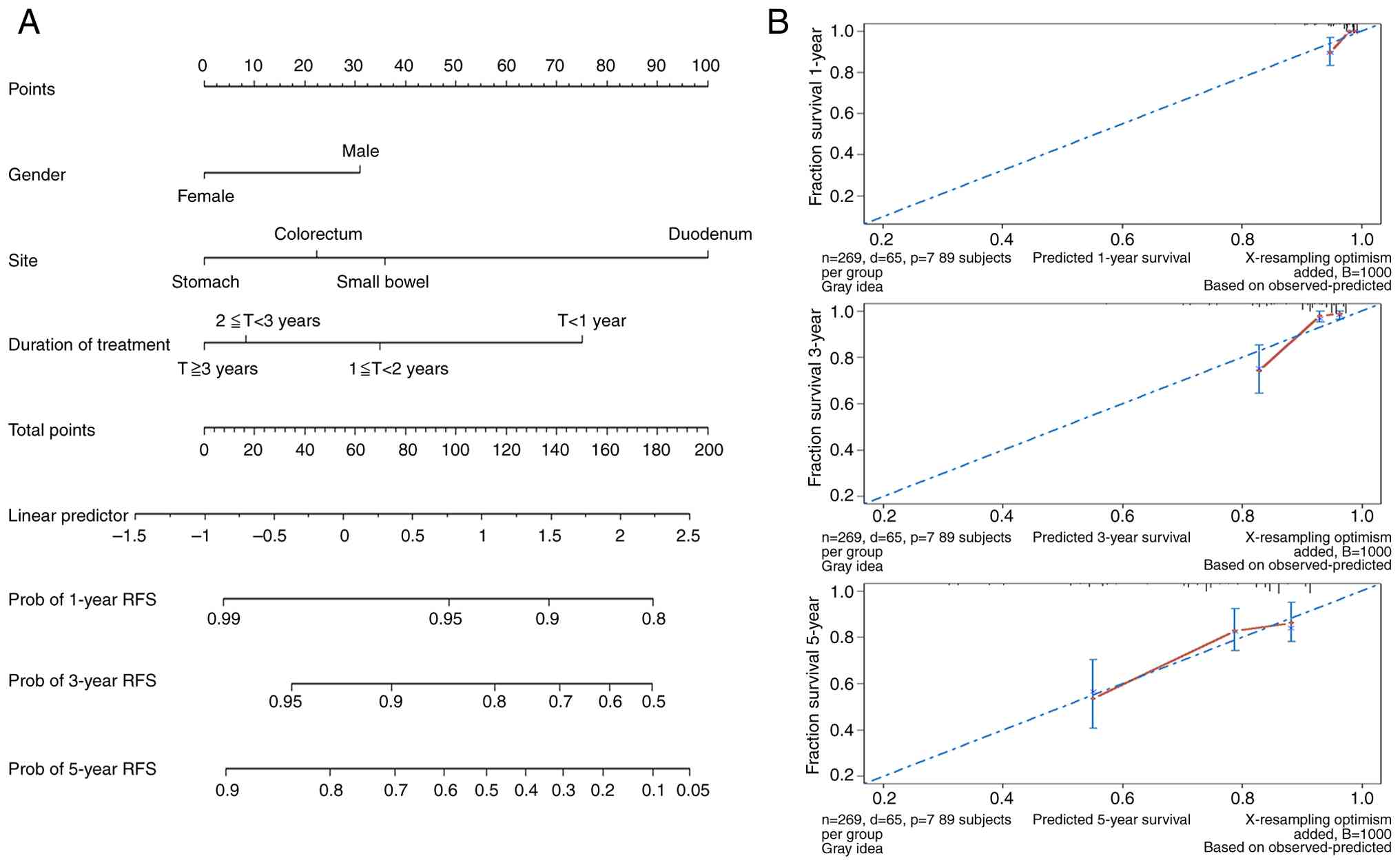 Table V presents the final multivariate Cox regression analysis. A total of 3 independent predictors of poor RFS were confirmed: Male sex (HR: 1.76, 95% CI: 1.03-3.00, P=0.039), non-gastric tumor origin with duodenum showing the highest risk (HR: 6.15, 95% CI: 2.71-13.95, P<0.0001), followed by the small bowel (HR: 1.92, 95% CI: 1.09-3.38, P=0.025), and treatment duration <1 year (HR: 3.91, 95% CI: 1.91-8.01, P=0.002). These variables were incorporated into the nomogram construction.