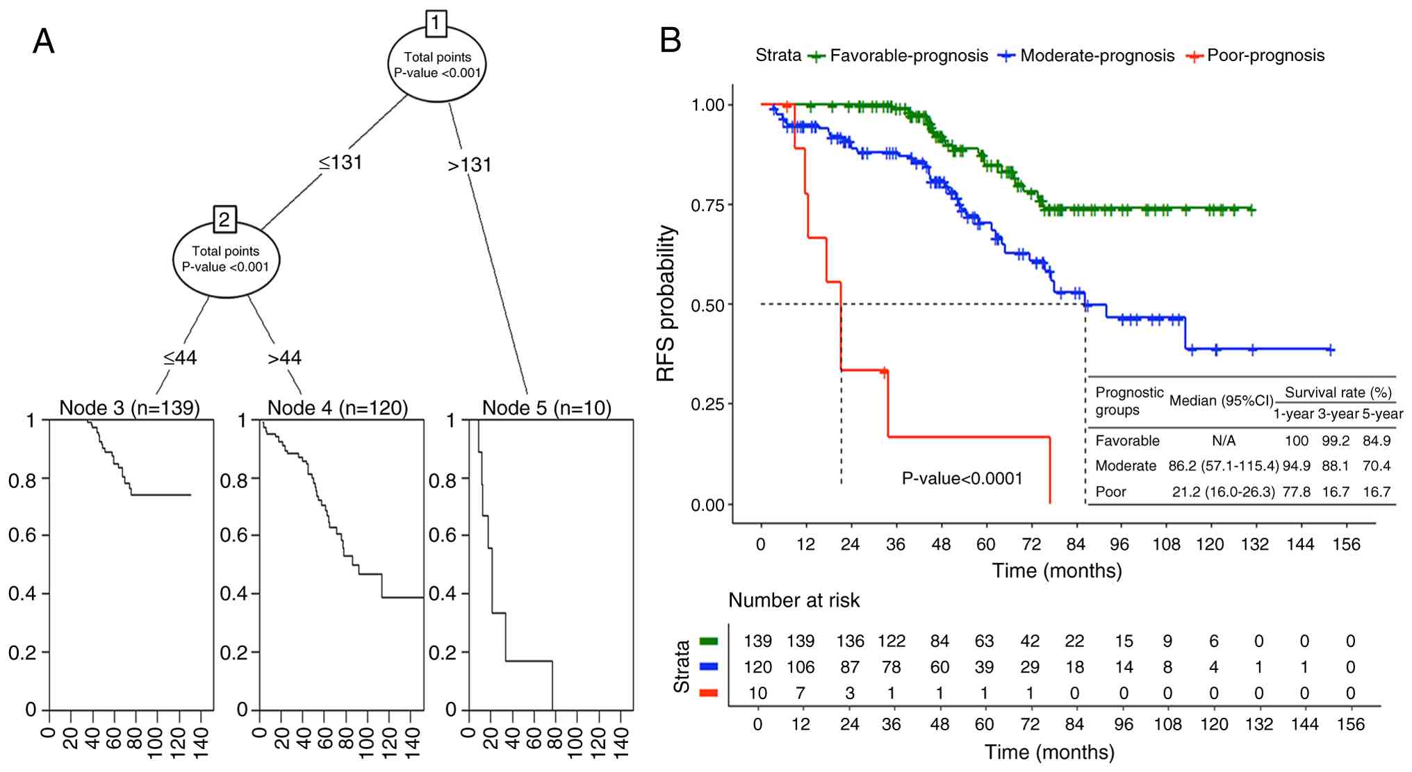 Recursive partitioning analysis (Fig. 3A) was used to establish optimal cut-off points for prognostic stratification based on nomogram scores. This analysis identified three distinct prognostic groups among the AFIP-classified high-risk GIST cohort of the present study. The favorable-prognosis group included 139 patients with nomogram scores indicating excellent long-term outcomes and achieved a 5-year RFS rate of 84.9%. The moderate-prognosis group comprised 120 patients with moderate risk scores and demonstrated a 5-year RFS rate of 70.4%. Most concerning, the poor-prognosis group consisted of 10 patients whose nomogram scores predicted markedly inferior outcomes, with these patients achieving only a 16.7% 5-year RFS rate despite all being AFIP-classified as high-risk and receiving adjuvant imatinib therapy (Fig. 3B). The survival differences between these nomogram-based prognostic groups were highly significant (P<0.0001) (Fig. 3B, Tables VII and VIII).