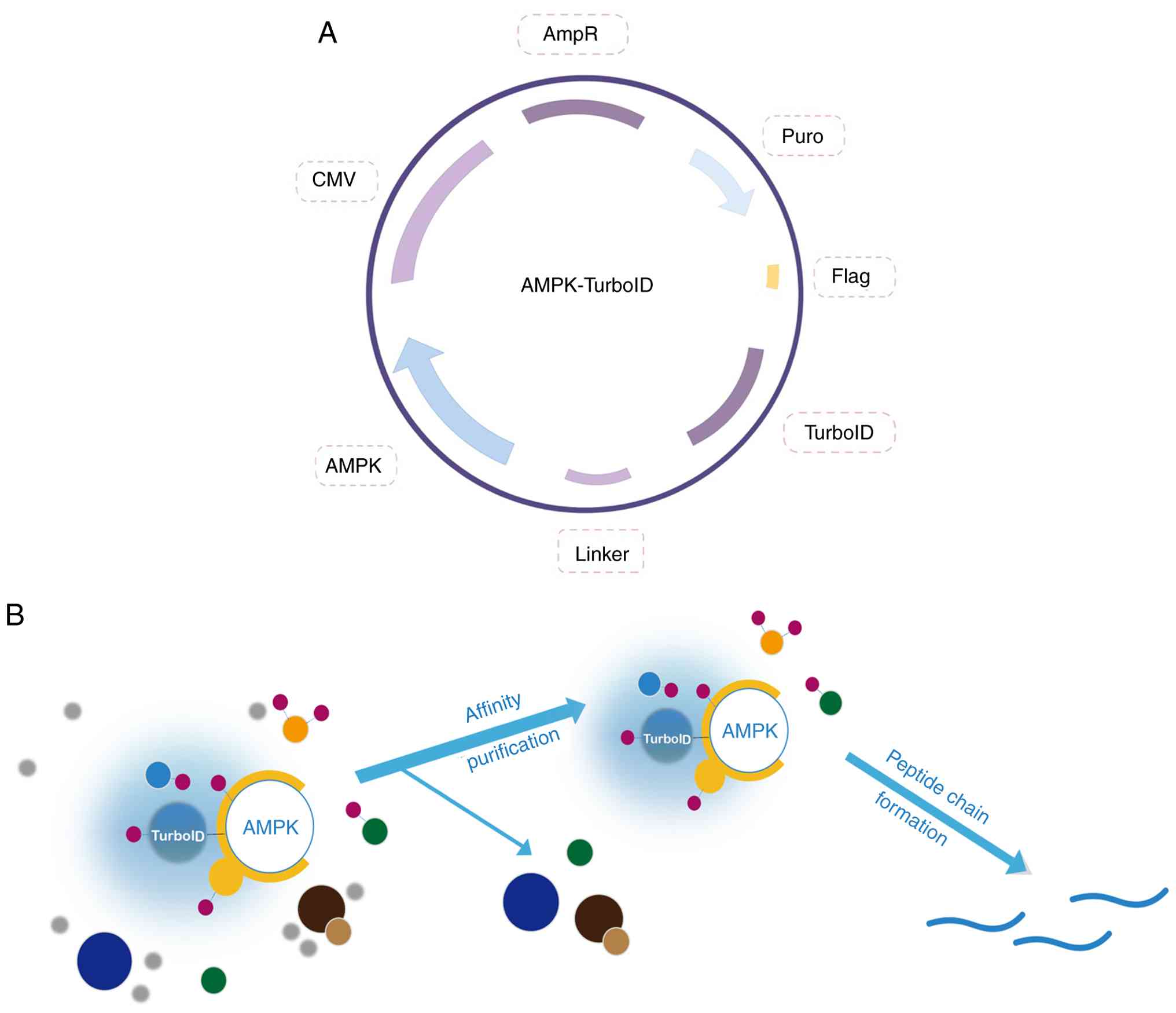 TurboID cDNA was synthesized and integrated into a plenti-cytomegalovirus (CMV)-EGFP (Beijing Tsingke Biotech Co., Ltd.) plasmid replacing the EGFP fragment (plenti-CMV-TurboID). This was conducted by Beijing Tsingke Biotech Co., Ltd. The AMPK gene was amplified using human cDNA as a template and the following primers: AMPK forward, 5'-atagaagacaccgactctagaATGGCTGAGAAGCAGAAGCAC-3'; AMPK reverse, 5'-catacgcgtgatatccccgggACGGGCTAAAGTAGTAATCAG-3' (the lowercase letters indicate restriction enzyme sites and protective bases, and the uppercase letters indicate the gene-specific sequences that anneal to the template). The thermocycling conditions were as follows: Initial denaturation at 94˚C for 5 min; followed by 30 cycles of denaturation at 94˚C for 30 sec, annealing at 56˚C for 30 sec and extension at 72˚C for 2 min; with a final extension at 72˚C for 8 min. The plasmid plenti-CMV-TurboID was double digested using XbaI and SmaI and the AMPK fragment was purified using a DNA purification kit and combined with the linearized plenti-CMV-TurboID plasmid. Positive clones were screened following transformation into E. coli TOP10 cells and selection on ampicillin (100 µg/ml)-containing LB agar plates. Plasmids were extracted using a high purity plasmid extraction kit, and then the extracted plasmids were processed through enzymatic digestion and sent to Beijing Qingke Biotechnology Co., Ltd. for sequencing of the insert. The selected plasmid was named AMPK-TurboID and was tagged with Flag.