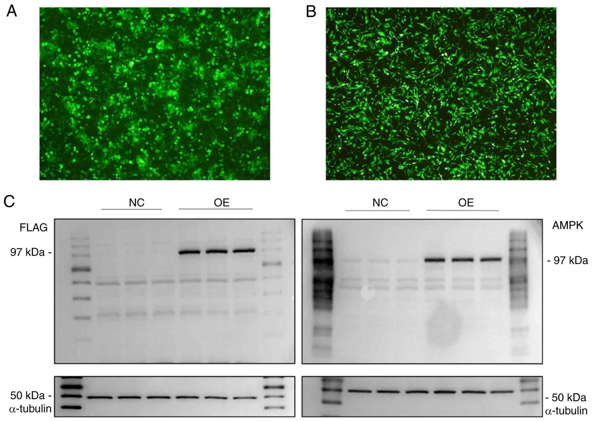 To confirm successful stable transfection, whole-cell lysates were prepared from the generated EGFP-U251 and AMPK-U251 cells, as well as control U251 cells. Cells were washed twice with ice-cold PBS and lysed in RIPA lysis buffer (cat. no. P0013B; Beyotime Biotechnology) supplemented with a protease inhibitor cocktail on ice for 30 min. The lysates were clarified by centrifugation at 12,000 x g for 20 min at 4˚C. Protein concentrations were determined using an Enhanced BCA Protein Assay Kit (cat. no. P0009; Beyotime Biotechnology). Equal amounts of protein (10 µg per lane) were denatured in 5X SDS-PAGE loading buffer at 95˚C for 10 min. The samples were then separated by SDS-PAGE on a 10% polyacrylamide gel at 120 V for 1.5 h. Following electrophoresis, the proteins were transferred onto a PVDF membrane (cat. no. IPVH00010; MilliporeSigma) using a wet transfer system at 250 mA for 150 min at 4˚C. The membrane was blocked with Quick Block™ Blocking Buffer (Beyotime Biotechnology) for 15-30 min at room temperature. Subsequently, the membrane was incubated overnight at 4˚C with primary antibodies diluted in blocking buffer. The following primary antibodies were used: Rabbit anti-AMPK polyclonal antibody (cat. no. 10929-2-AP; Proteintech Group, Inc.) and rabbit anti-FLAG polyclonal antibody (cat. no. 80801-2-RR; Proteintech Group, Inc.), both diluted at 1:1,000. GAPDH was used as a loading control. After washing three times with TBST (10 min each), the membrane was incubated with the HRP-conjugated goat anti-rabbit IgG secondary antibody (cat. no. SA00001-2; diluted at 1:5,000; Proteintech Group, Inc.) for 1 h at room temperature. Protein bands were visualized using an enhanced chemiluminescence detection reagent (cat. no. BL523A; Biosharp Life Sciences). The signals were captured using a chemiluminescence imaging system (ChemiDoc™ MP Imaging System; Bio-Rad Laboratories, Inc.). Densitometric analysis of the bands was performed using ImageJ software (Version 1.53, National Institutes of Health, Bethesda, MD, USA).