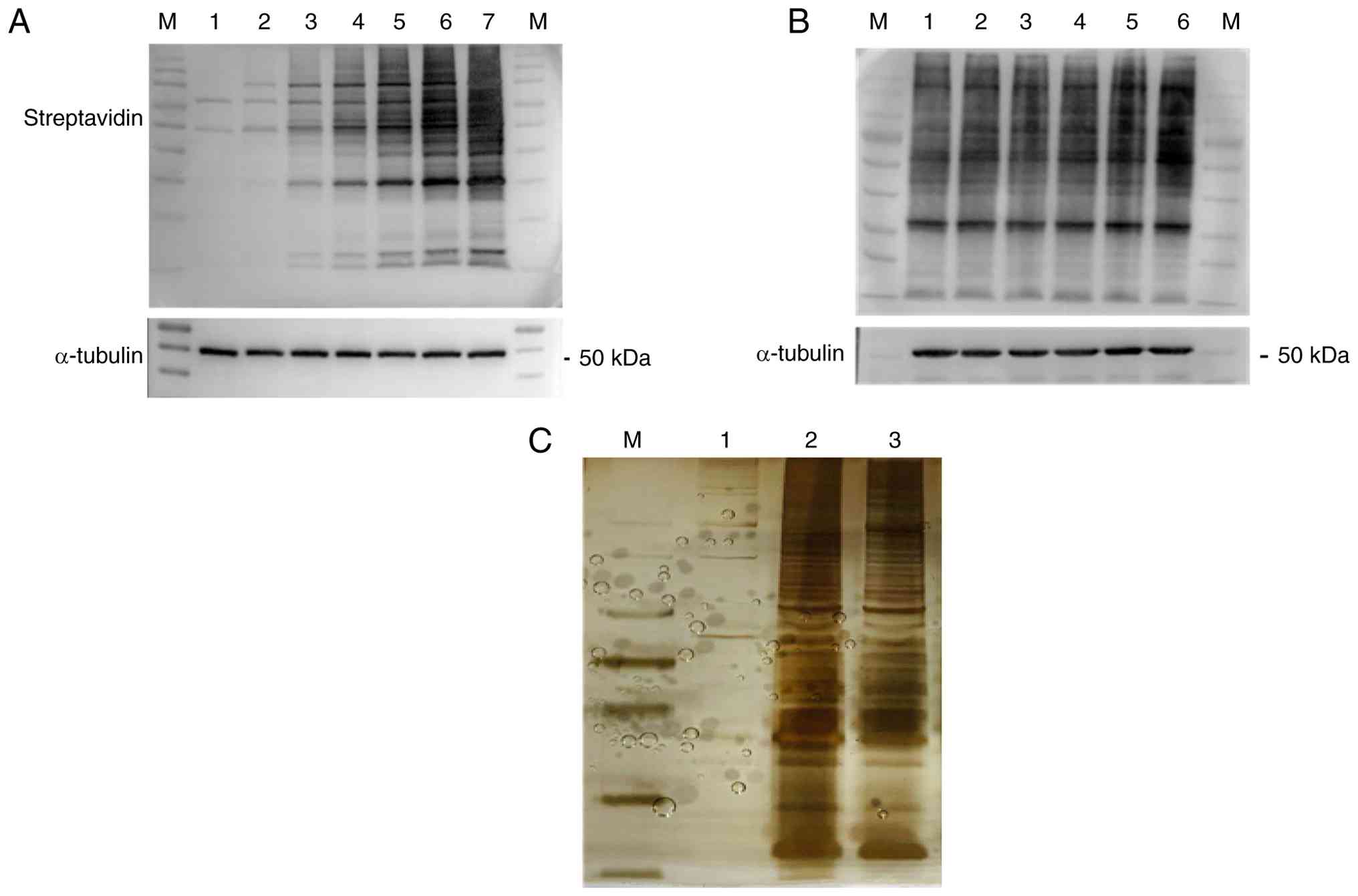 The results of the biotin labeling assay showed that interacting proteins of AMPK appeared after 10 min and more markedly after 1 h of labeling (Fig. 3A). To prevent oversaturation of biotin labeling, 6 h was used as the biotin labeling time of AMPK-U251 cells in the subsequent experiment. The results showed that there was some improvement in biotin labeling efficiency with the addition of ATP, however the effect was limited (groups 4-6; Fig. 3B). Considering the possible effect of the addition of ATP on the activity of AMPK, ATP was not added to the subsequent biotin-labeling buffers in the present study.