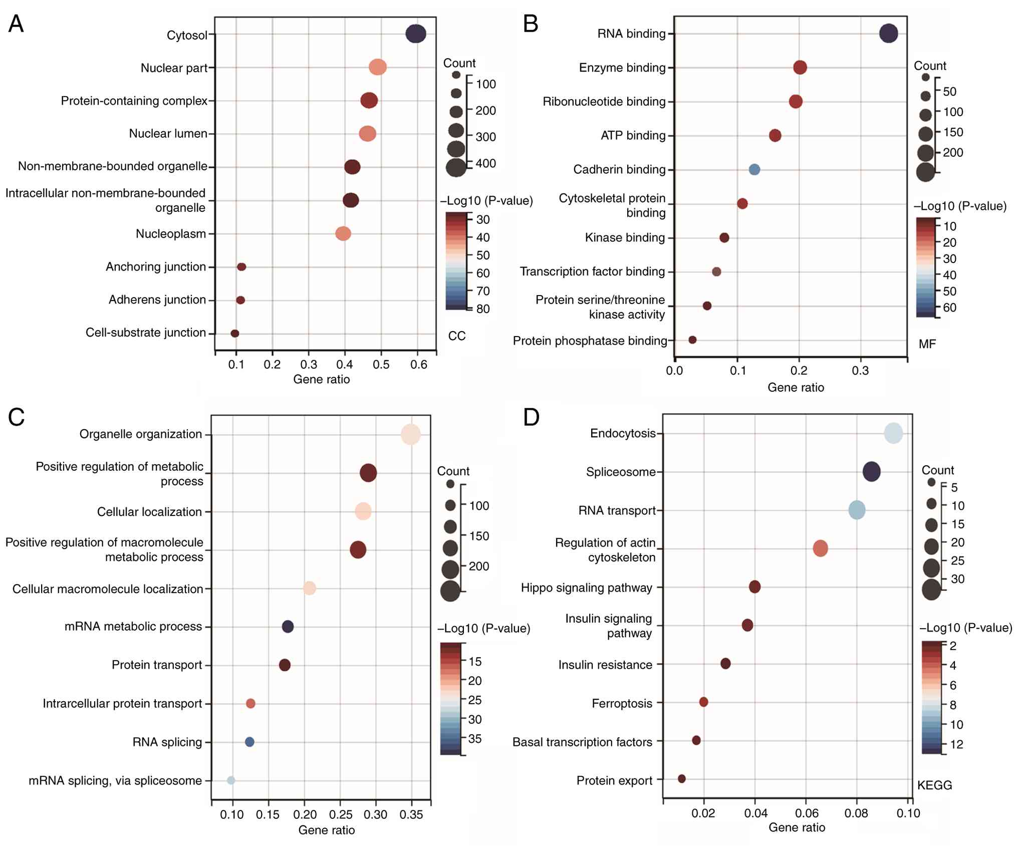 The online analysis tool Sangerbox 3.0 was used for GO and KEGG analysis. A total of 1,045 interacting proteins in the AMPK overexpression group were selected for analysis. In the analysis of cellular components, the terms ‘cytosol’, ‘nuclear part’, ‘protein-containing complex’, ‘nuclear lumen’ and ‘non-membrane-bounded organelle’ were enriched (Fig. 4A). In the analysis of molecular functions, the search revealed enrichment of ‘RNA binding’, ‘enzyme binding’, ‘ribonucleotide binding’ and ‘ATP binding’ (Fig. 4B). The enrichment of ‘ATP binding’ reflects AMPK's function as a cellular energy sensor, while ‘RNA binding’ suggests a potential role in post-transcriptional regulation. In addition, a number of significantly enriched terms were identified in the analysis of biological processes, including ‘organelle organization’, ‘positive regulation of metabolic process’, ‘cellular localization’, ‘positive regulation of macromolecule metabolic process’ and ‘cellular macromolecule localization’ (Fig. 4C). These terms directly reflect AMPK's central role in coordinating metabolism and organelle dynamics. In the KEGG analysis, pathways that were found to be enriched included ‘endocytosis’, ‘spliceosome’, ‘RNA transport’, ‘regulation of actin cytoskeleton’, ‘Hippo signaling pathway’, ‘insulin signaling pathway’, ‘insulin resistance’ and ‘ferroptosis’ (Fig. 4D).
