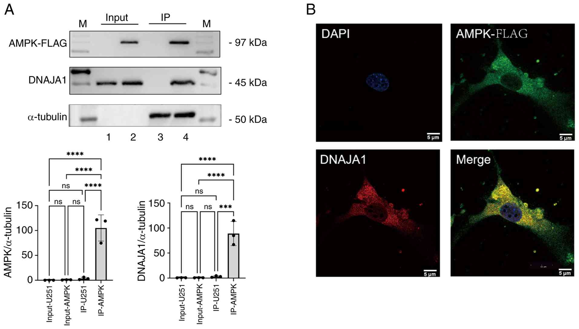 Immunofluorescence detection of the localization of AMPK and DNAJA1 in U251 cells further provided a basis for the interaction between AMPK and DNAJA1. Fig. 5B shows that both AMPK and DNAJA1 were localized in the cytoplasm, providing a spatial and temporal basis to further determine the interactions between AMPK and DNAJA1.