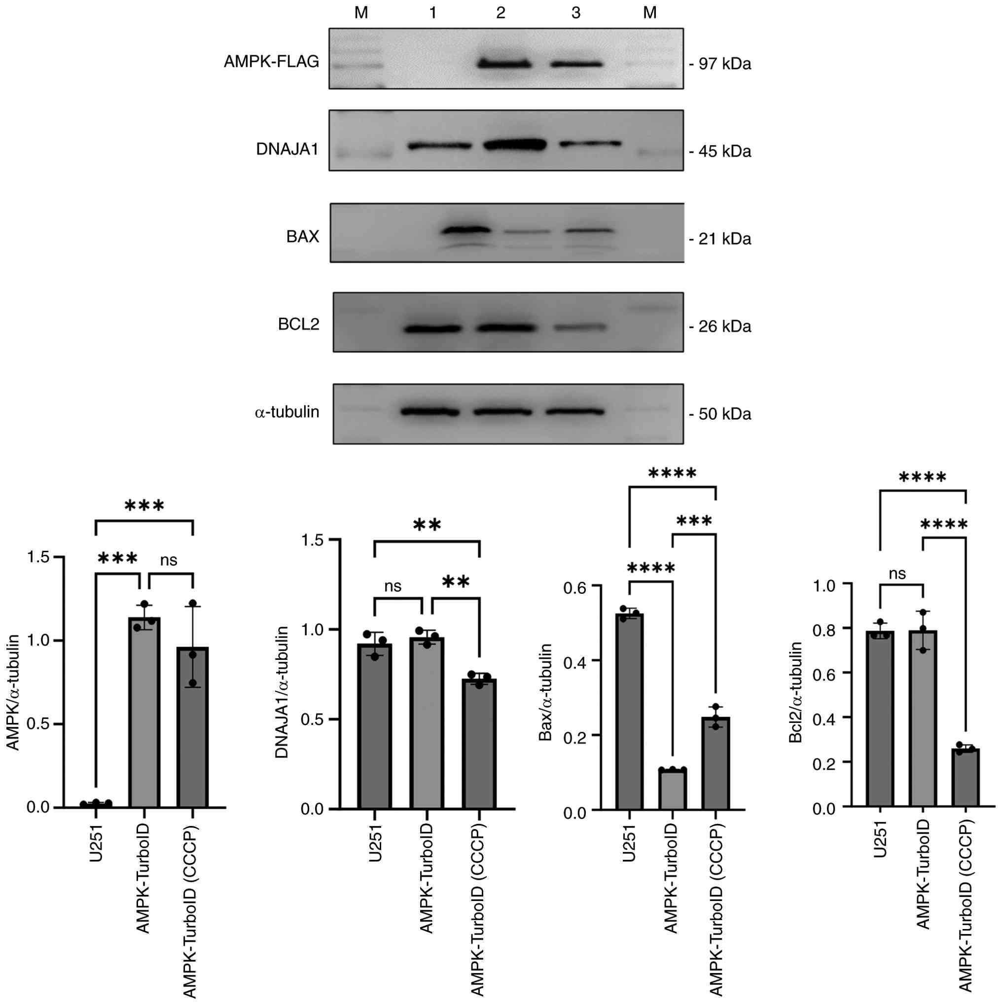 It has previously been established (33) that DNAJA1 is involved in the negative regulation of Bax and thus participates in the anti-apoptotic process. The present study demonstrated the existence of an interaction between AMPK and DNAJA1 and therefore hypothesized that AMPK may interact with DNAJA1 to participate in the anti-apoptotic pathway of cells. As shown in Fig. 6, the expression levels of DNAJA1 were showed a slight non-significant increase and the expression level of Bax was decreased in the AMPK overexpressing cell line compared with those in the U251 cell line, while Bcl2 expression showed no significant change, indicating that the apoptotic process may be attenuated in AMPK overexpressing cells. CCCP is a mitochondrial uncoupler that disrupts mitochondrial membrane potential and depletes cellular ATP levels, thereby inhibiting AMPK activity (34). The CCCP-treated AMPK-TurboID overexpressing cell line exhibited significantly weakened DNAJA1 and Bcl2 levels but enhanced Bax levels compared with those in the AMPK overexpressing cells without CCCP treatment.