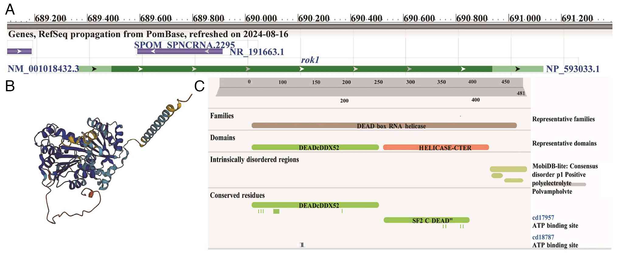 The rok1 gene encodes the ATP-dependent RNA helicase Rok1 in S. pombe, which is a member of the DEAD box protein family (Fig. 1). In cells, the Rok1 protein is localized in the nucleolus and is involved in regulating the maturation of small subunit ribosomal RNA (rRNA) and thus the process of ribosome biogenesis (20). In budding yeast, the Rok1 protein binds to ATP, stabilizes the binding of its cofactor Rrp5 to the 40S ribosome (21) and is involved in rRNA processing and control of cell cycle progression in budding yeast (22). In fission yeast, rok1 gene deletion results in decreased cell growth under high-temperature conditions and in media with galactose, maltose, sucrose or xylose as the carbon source, increased growth in media with lysine, proline or serine as the nitrogen source and increased susceptibility to bleomycin, brefeldin A, cycloheximide, diamide, formamide and sodium dodecyl sulfate. Abnormal chromosome segregation during meiosis was also observed in rok1∆ cells (23). In addition, the rok1 gene is closely associated with human diseases, and Rok1 and Cd168 accelerate the progression of androgen-independent (AI) prostate cancer and accelerate the invasion and metastasis of AI cells in the endothelial layer of human bone marrow (24).