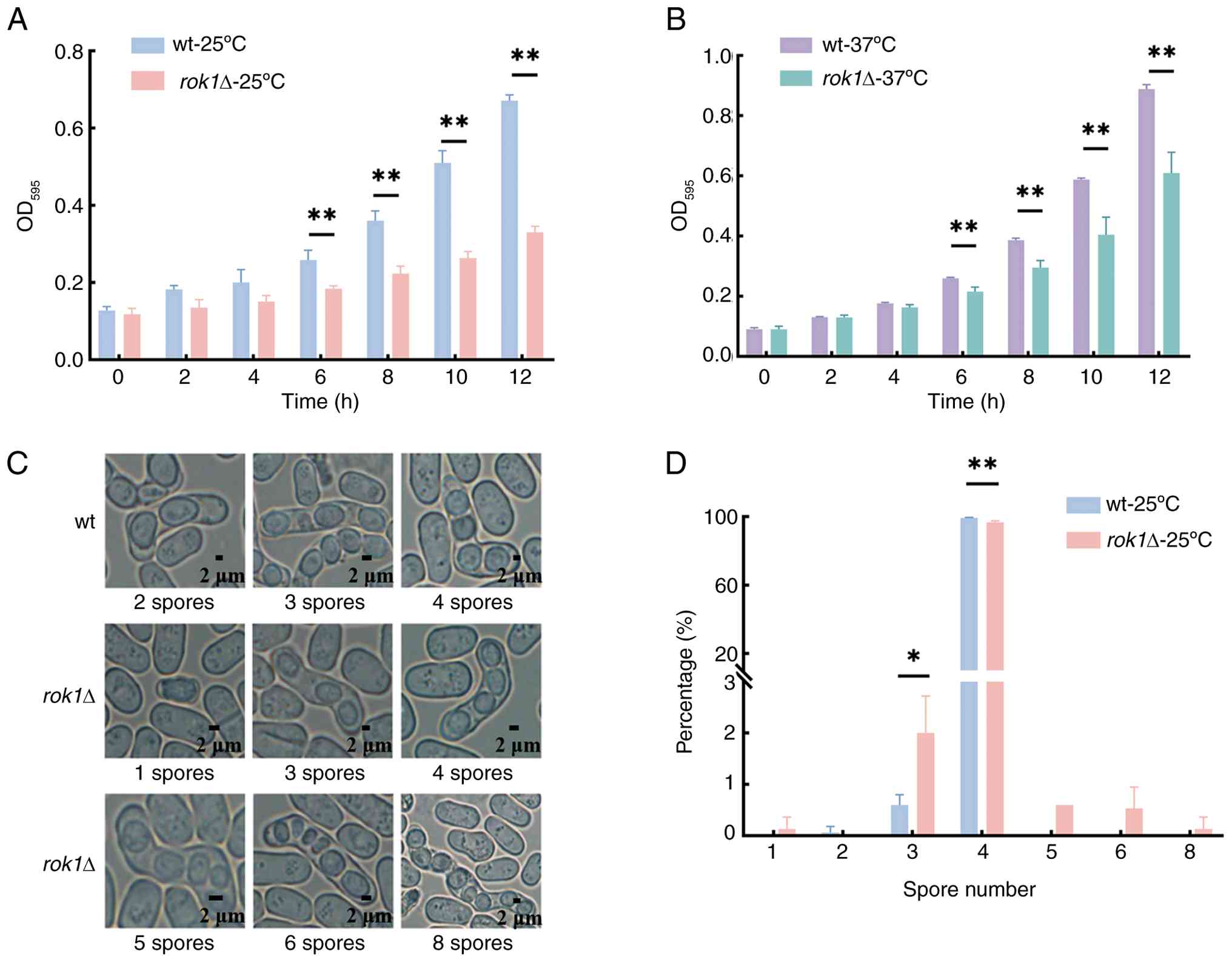The growth rates of the wild-type strain and the rok1Δ strain were compared and the results showed that there was no significant difference in growth rates between the two over the period of 0-4 h at 25˚C and 37˚C (all P>0.05). After 6 h, the wild-type strain entered the logarithmic growth phase and the growth rate of the rok1Δ strain significantly decreased. At 25˚C, optical density (OD)595 at 12 h was 0.68±0.00 and 0.33±0.02 for the wild-type and rok1Δ strains, respectively. At 37˚C, OD595 at 12 h was 0.89±0.01 and 0.61±0.07 for the wild-type and rok1Δ strains, respectively (Fig. 2A and B), which were significantly different (P<0.01). The aforementioned results indicated that rok1 gene deletion significantly decreased the cell growth rate.