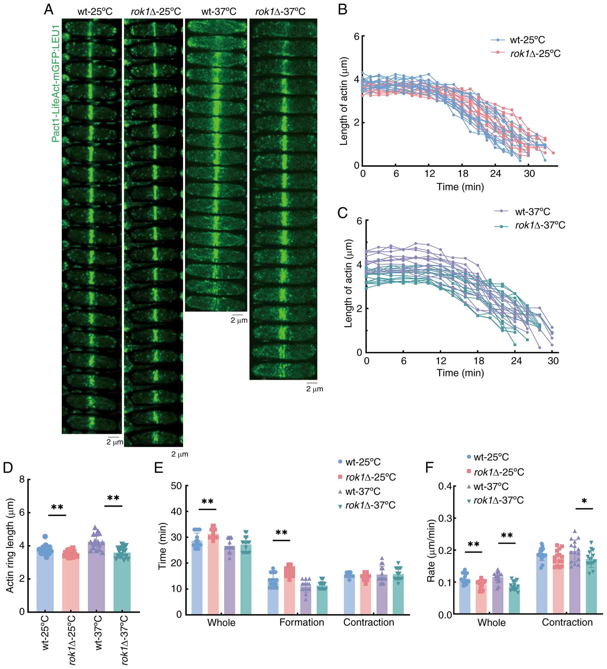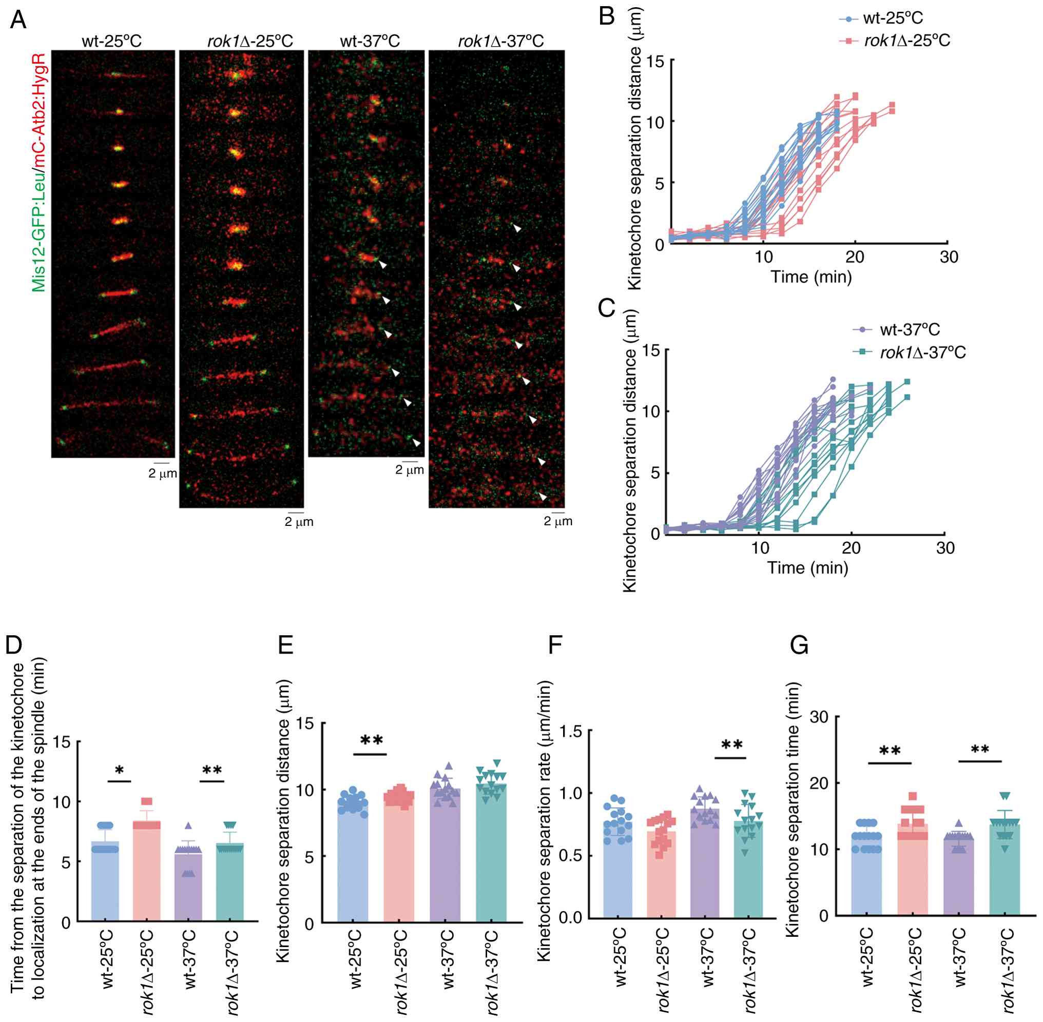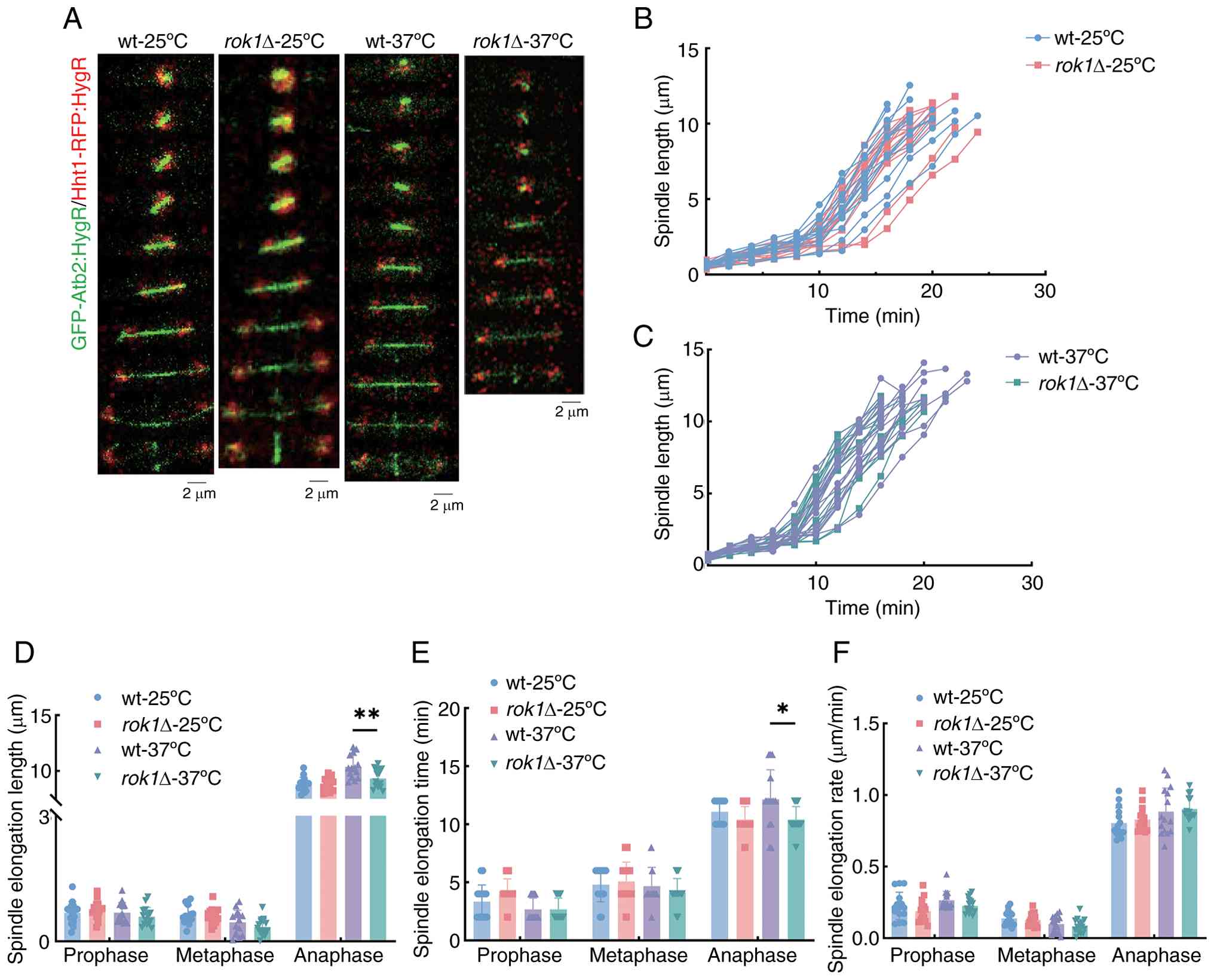 These results indicate that the rok1 gene deletion decelerated the spindle elongation process at 37˚C. Comparison of 25˚C and 37˚C revealed that a high temperature stress of 37˚C had an inhibitory effect on the spindle elongation process.