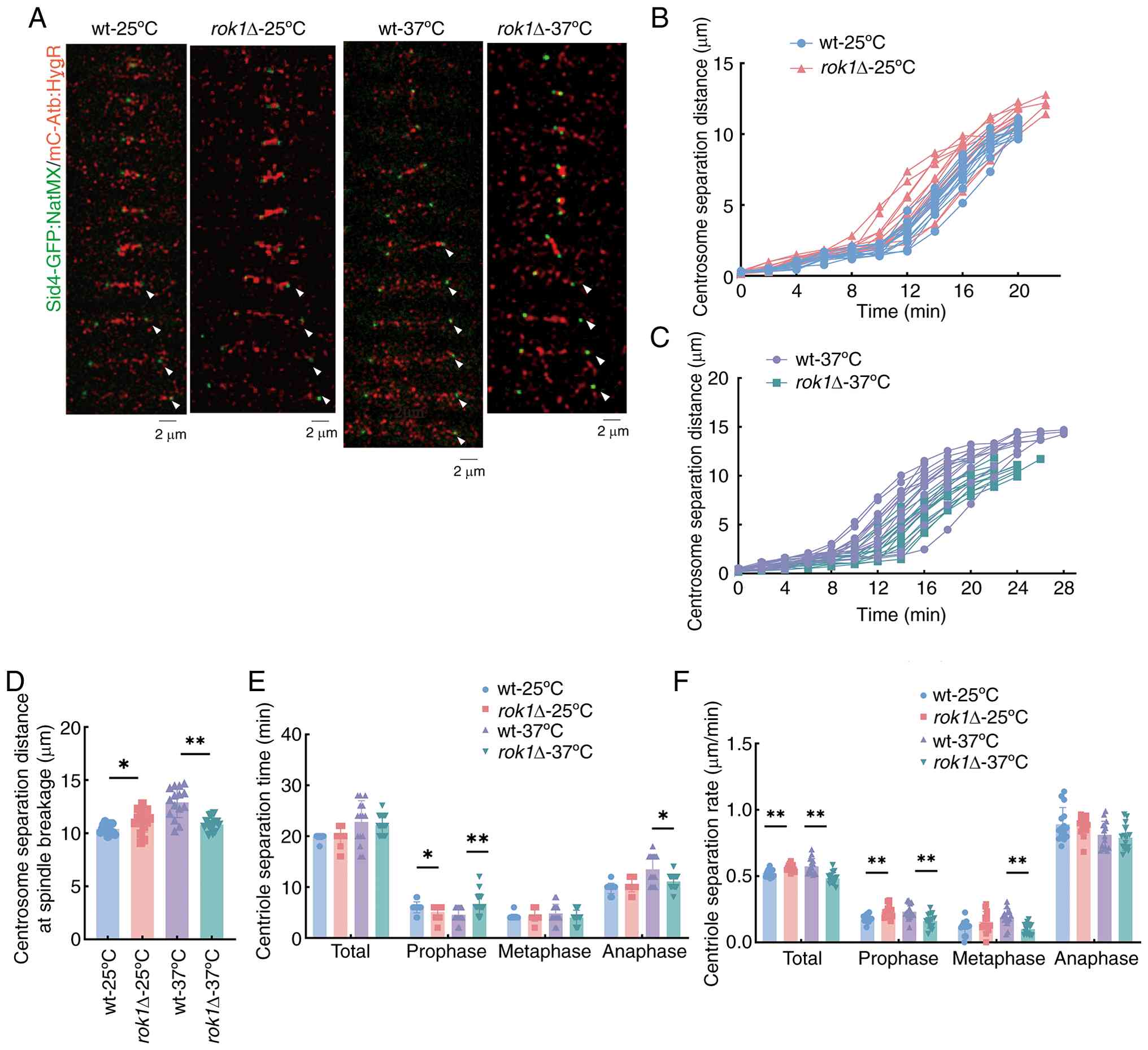 When the experiments were conducted at 37˚C, the total separation time was not significantly altered (22.80±4.20 vs. 22.53±1.77 min); on the other hand, there was a significant decrease in both the final separation distance (12.90±1.44 vs. 10.82±0.63 µm) and the total centrosome separation rates (0.57±0.06 vs. 0.48±0.04 µm/min) in the rok1Δ strains compared with wild-type. Further analysis of the centrosome separation process revealed that the centrosome separation time of the wild-type and rok1Δ strains at different phases were as follows: Prophase, 4.53±1.41 and 7.07±2.12 min; metaphase, 4.80±1.82 and 3.87±1.60 min; and anaphase, 13.47±2.88 and 11.60±1.12 min, in wild-type and rok1Δ strains, respectively. The centrosome separation rates were as follows: Prophase, 0.23±0.06 and 0.16±0.05 µm/min; metaphase, 0.19±0.06 and 0.10±0.04 µm/min; and anaphase, 0.81±0.10 and 0.79±0.10 µm/min, in wild-type and rok1Δ strains, respectively. The centrosome separation time at prophase in the rok1Δ strain was significantly increased, but the separation time at anaphase was significantly decreased compared with the wild-type. Furthermore, the separation rate of the rok1Δ strain was significantly decreased at prophase and metaphase compared with the wild-type. These results indicated that at 37˚C, rok1 gene deletion shortened the centrosome separation distance and decreased the separation rate. Comparison of results at 25 and 37˚C revealed that 37˚C high temperature stress reversed the effect of rok1 gene deletion on the centrosome segregation process.