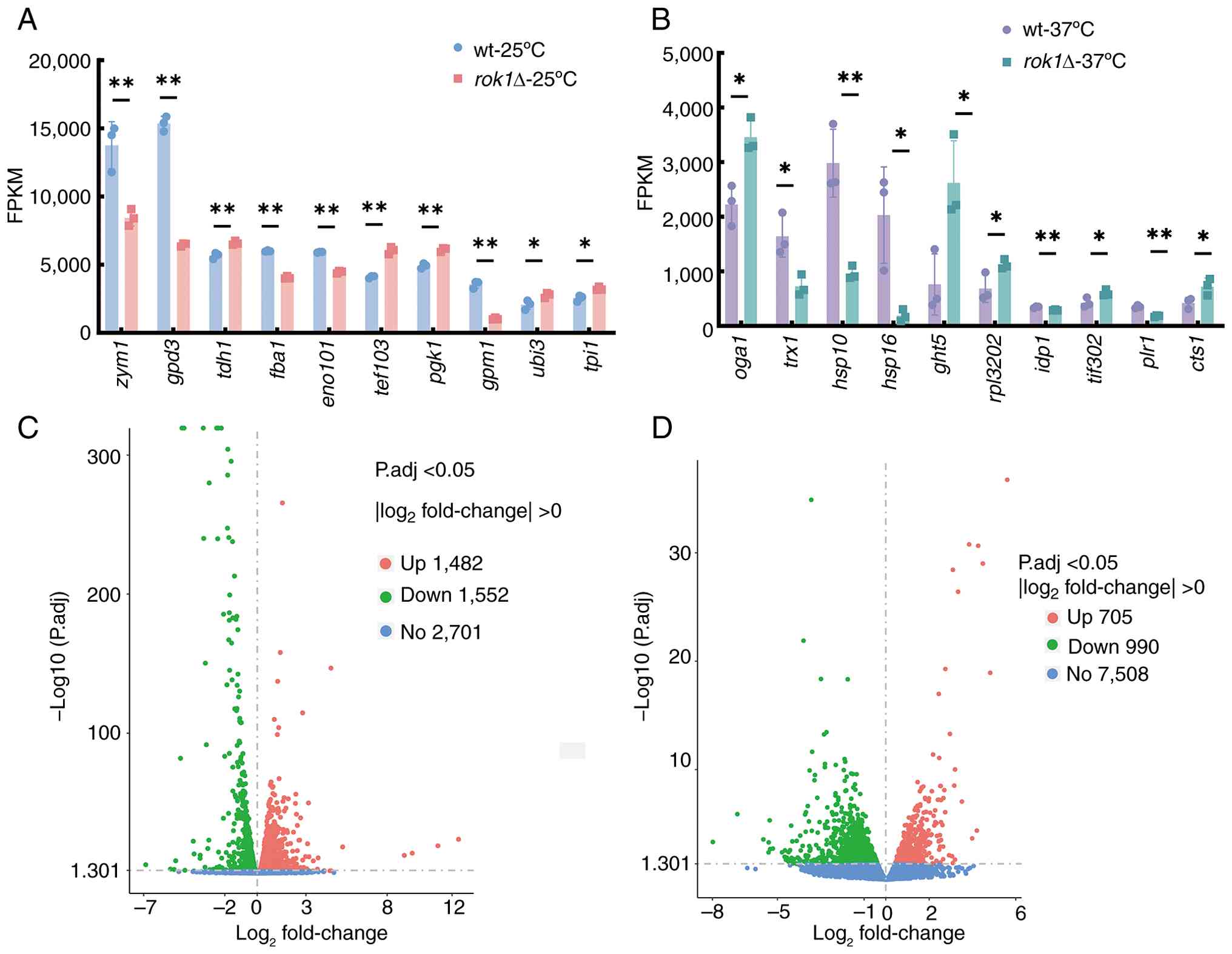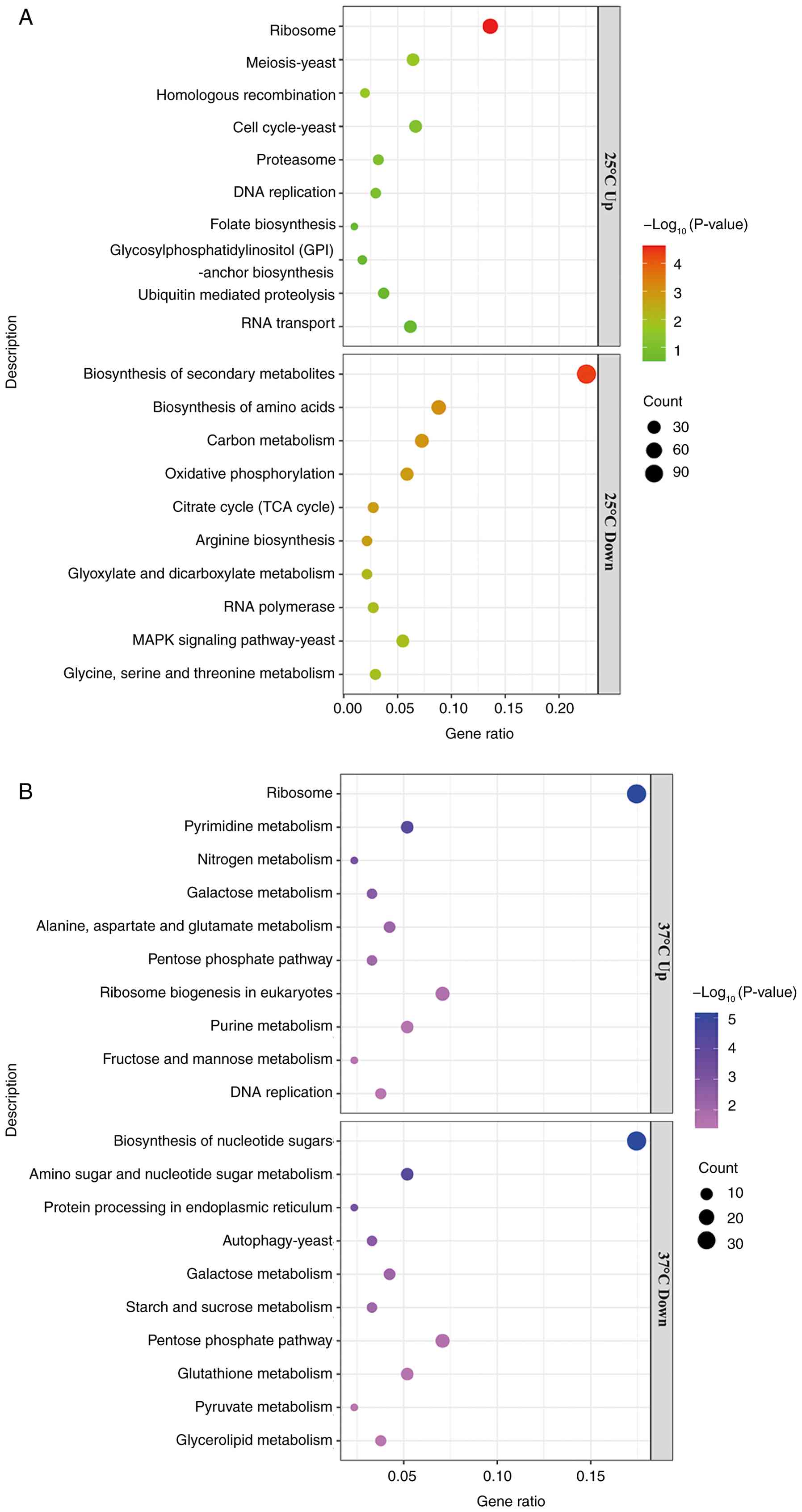 The differentially expressed genes of the wild-type strain and the rok1Δ-25˚C and rok1Δ-37˚C strains were analyzed. The results indicated that there were 3,034 and 1,695 differentially expressed genes in the rok1Δ-25˚C and rok1Δ-37˚C strains, respectively, compared with the wild-type strains, which included 1,482 and 705 upregulated genes and 1,552 and 990 downregulated genes, respectively (Fig. 7C and D).