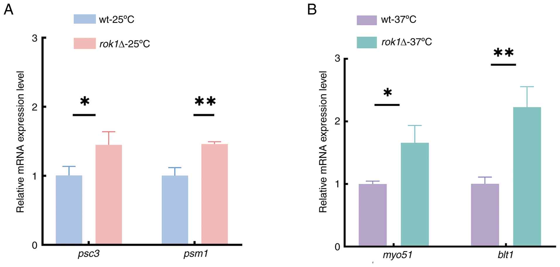 The RT-qPCR results showed that the expression levels of psc3 and psm1 were significantly upregulated at 25˚C (Fig. 8A); in addition, myo51 and blt1 were significantly upregulated at 37˚C (Fig. 8B) with rok1 deletion compared with the wild-type. These findings were consistent with the RNA-Seq data, confirming the reliability of the transcriptomic results. These results suggest that rok1 regulate the expression of these key genes, thereby influencing the dynamics of mitotic progression.