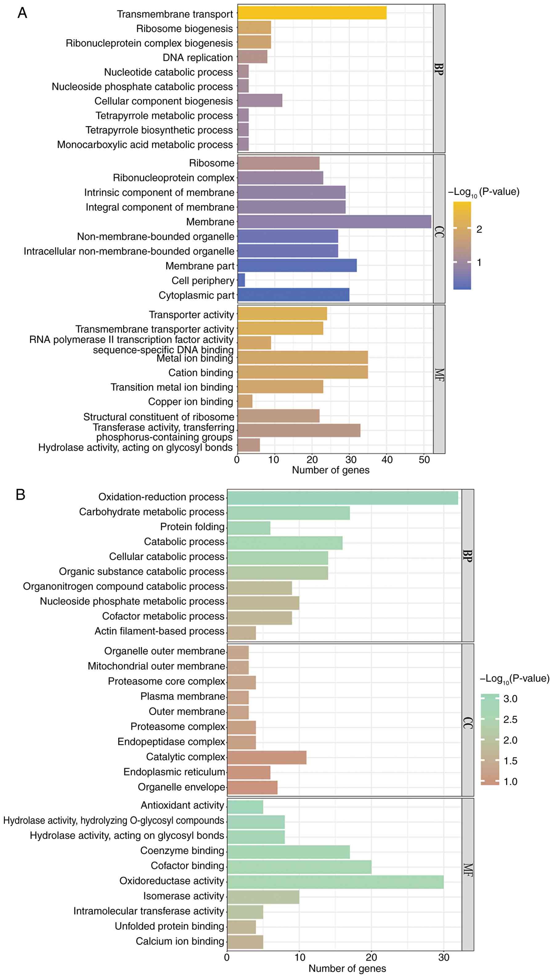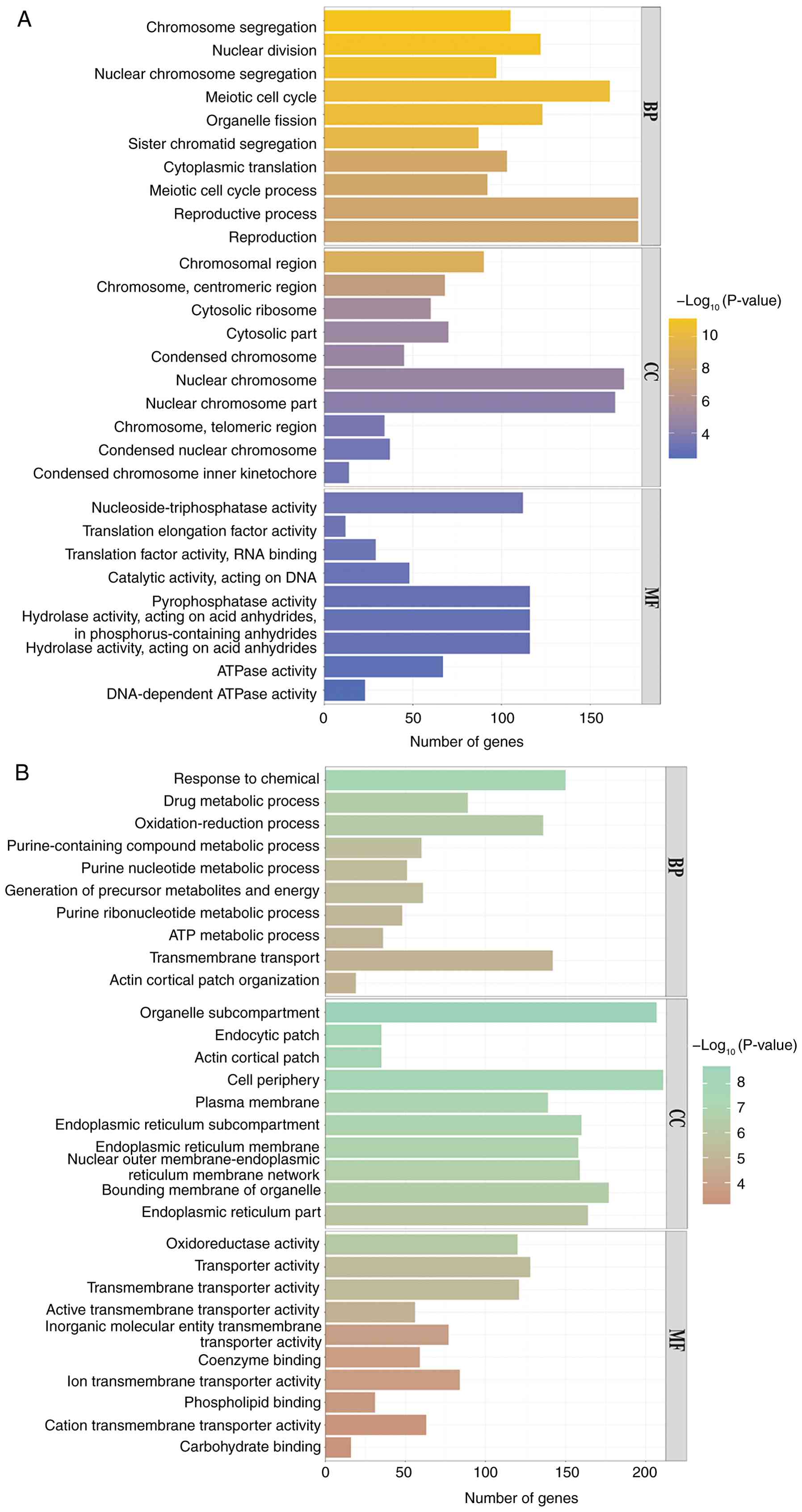 GO enrichment analysis of differentially expressed genes was performed in wild-type and rok1Δ strains, and the 10 categories with the most significant up- and downregulated differentially expressed genes were selected and plotted as bar graphs. The analysis revealed that at 25˚C, the rok1Δ strain was enriched for differential genes up to 303 GO branches (P≤0.05), including 230 biological processes, 41 cellular components and 32 molecular functions, compared with the wild-type strain. Among the biological processes, upregulated genes were enriched in ‘sister chromatid segregation’ and ‘reproductive process’. In cellular components, upregulated genes were enriched in ‘chromosomes, centromeric region’ and ‘condensed chromosome inner kinetochore’ regions. In molecular function, upregulated genes were enriched in ‘nucleoside-triphosphatase activity’ and ‘translation elongation factor activity’ (Fig. 9A). In addition, downregulated differential genes were enriched in ‘purine-containing compound metabolic process’ and ‘actin cortical patch organization’, ‘actin cortical patch’ and ‘plasma membrane’ regions in cellular components, with ‘transmembrane transporter activity’ and ‘oxidoreductase activities’ in molecular functions (Fig. 9B).