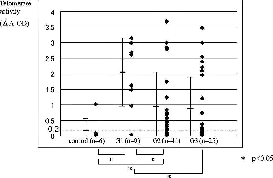 The present data were consistent with the findings of Lancelin et al (5). Telomerase activity may therefore play an important role in malignant alteration, but is not necessarily associated with tumor invasiveness and progression.