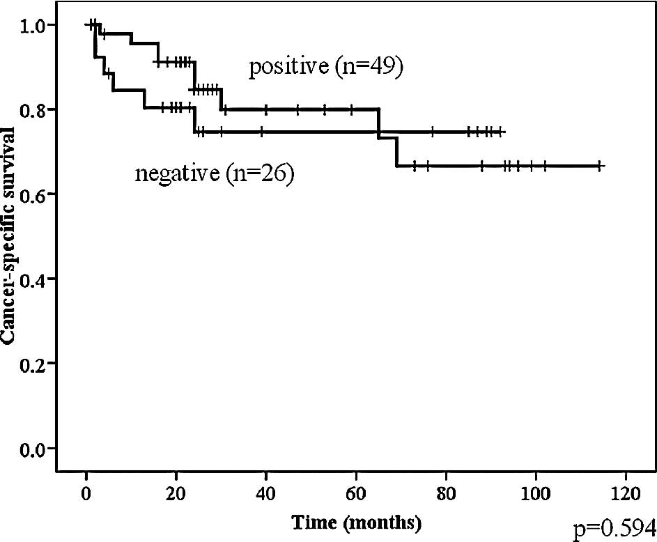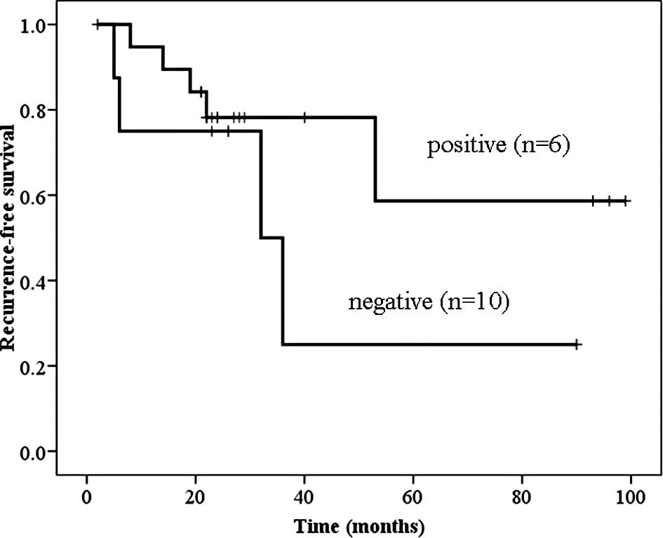 Statistical analysis was performed using the Mann-Whitney U test and χ2-test to evaluate the significance of the differences between the patient groups. The Kaplan-Meyer method was used to summarize the distribution of cancer-specific survival and recurrence-free survival, and the log-rank test was used to evaluate individual factors with respect to these outcomes. P-values <0.05 were considered to be significant.