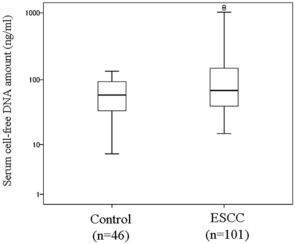 Box and whisker plot of cell-free DNA (cfDNA) levels in sera from patients with esophageal squamous cell carcinoma (ESCC) and control patients without ESCC. Serum cfDNA levels were significantly higher in ESCC patients (median, 67.5 ng/ml; range, 15–1236 ng/ml) than in control patients without known ESCC (median, 59 ng/ml; range, 7–135 ng/ml) (P=0.034).