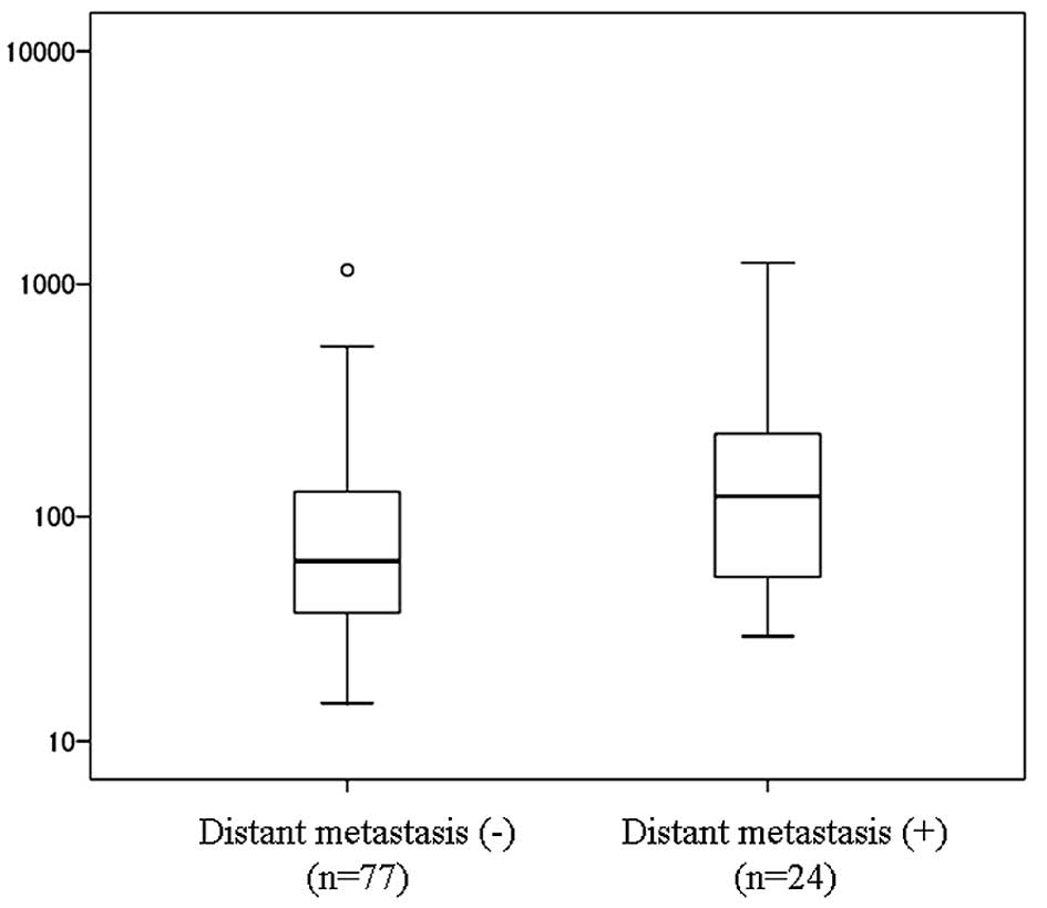 Box and whisker plot of cell-free DNA (cfDNA) levels in sera from patients with distant metastasis and those without. The serum cfDNA level was significantly higher in patients with distant metastasis (median, 83 ng/ml; range, 30–1236 ng/ml) than in those without (median, 74 ng/ml; range, 15–1152 ng/ml) (P=0.011).