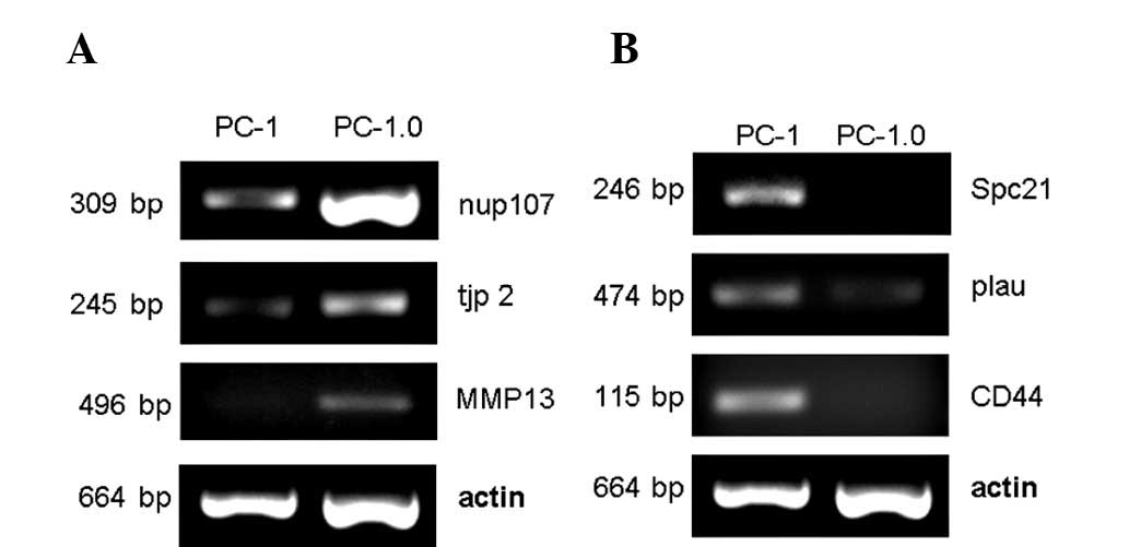 Pancreatic cancer is known to be an extremely lethal neoplasm, one of the reasons being that pancreatic cancer itself has an extremely high potential of invasion-metastasis. In our previous study, two pancreatic cancer cell lines with a different potential for invasion-metastasis, PC-1 with a low potential and PC-1.0 with a high potential of invasion-metastasis after intrapancreatic transplantation, were established in a Syrian golden hamster. To determine the invasion-metastasis-related factors, a cDNA microarray that represented a set of 27,000 genes was hybridized with a labeled cDNA probe and screened for molecular profiling analysis. Furthermore, Gene Ontology and Pathway differential expression of candidate genes was further validated using RT-PCR. One hundred and forty-one differentially expressed genes (>3.0-fold change) were identified in the present study, including 46 up-regulated genes (e.g., nup107, tjp-2 and MMP-13) and 95 down-regulated genes (e.g., Spc21, plau and CD44) in the PC-1.0 cells. Our present results suggest that a highly organized and structured process of tumor invasion-metastasis exists in the pancreas. Analysis of gene expression profiles by cDNA microarray provides useful information for clarifying the mechanism underlying this invasion and metastasis. Furthermore, the identification of invasion-metastasis-specific genes may allow us to develop new therapeutic and diagnostic targets for the invasion-metastasis of pancreatic cancer.
