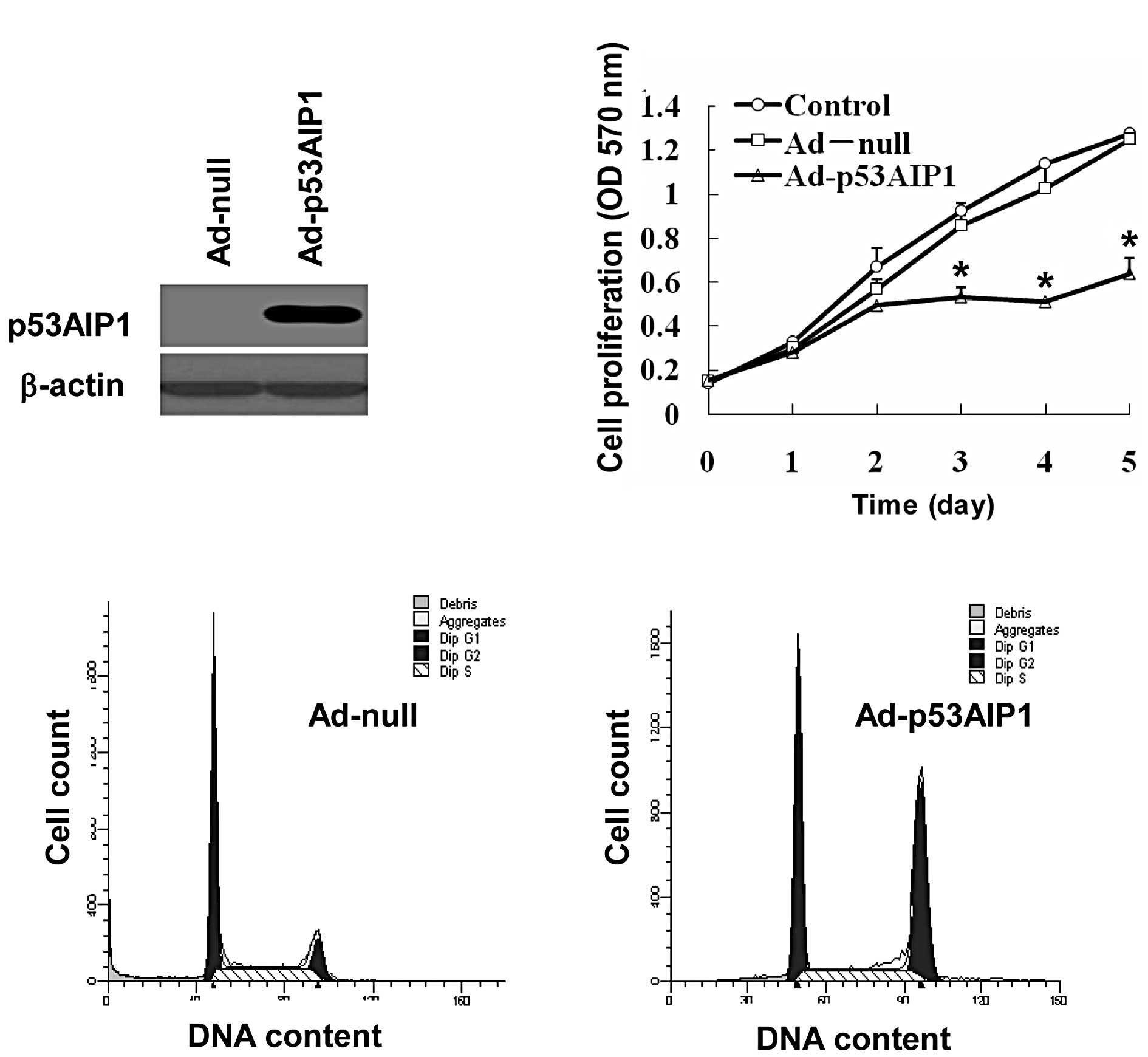 To test the effect of Ad-p53AIP1 transduction on cell proliferation, we treated HepG2 cells with 100 MOI of Ad-null or Ad-p53AIP1 virus and compared their proliferation rates with the non-treatment control. As shown in Fig. 1B, the proliferation of Ad-p53AIP1-transduced cells was significantly inhibited, which was approximately one half of the control cells on day 5. To test whether Ad-p53AIP1 has any effect on cell cycle progression, we analyzed the cell cycle distribution of HepG2 cells infected with Ad-p53AIP1 for 24 h. We found that p53AIP1 expression increased the number of HepG2 cells in G2/M phases. Since this was accompanied by decreased proliferation, the data suggest that Ad-p53AIP1 induced G2/M arrest in HepG2 cells, which contributed to its growth inhibition effect (Fig. 1C).