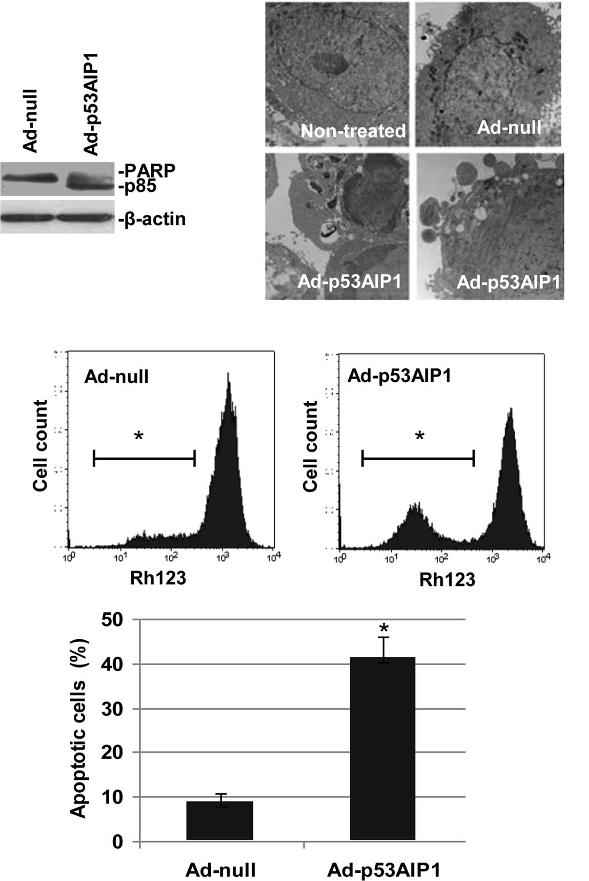 The clinical relevance of p53AIP1 is supported by reports on its association with prognosis and therapeutic potential. Sawaya et al reported that p53AIP1 mRNA levels were significantly lower in gastric carcinoma cells, as compared to chronic gastritis samples (13). Data by Yamashita et al revealed that p53AIP1 gene expression in a lymph node metastasis-positive group was significantly lower than in a negative group, and the overall survival of a p53AIP1 low expression group was significantly worse than that of a p53AIP1 high expression group (14). A study by Yoshida et al indicated that Ad-p53AIP1 induced apoptosis in a number of cancer cell lines. It appeared that cells with wild-type p53 were more sensitive to Ad-p53AIP1 than cells with mutant p53 (5). However, the mechanism of p53-related sensitivity was not elucidated.