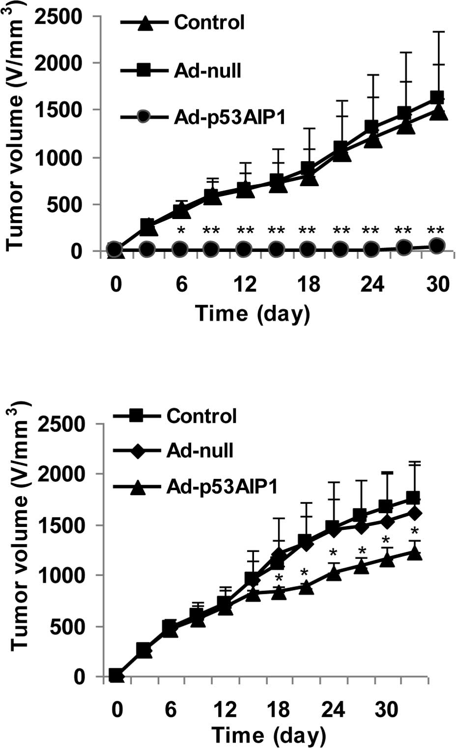 We next examined the efficacy of Ad-p53AIP1 on tumor growth in vivo using a 4T1 breast tumor model. In the first set of experiments, 4T1 tumor cells were treated with control (PBS), Ad-null or Ad-p53AIP1 virus for 24 h before implantation. The results showed that the tumors in the control and Ad-null groups grew progressively, reaching ∼1,700 mm3 by day 30. In contrast, tumor growth was minimal in the group treated with Ad-p53AIP1. The tumors were not palpable until day 21 (Fig. 3A). The striking difference between the control and Ad-p53AIP1-treated tumors indicates that Ad-p53AIP1 has a potent tumor inhibition effect. In the second set of experiments, we tested the effect of Ad-p53AIP1 on the progression of 4T1 tumors. After the tumors were palpable, 2×108 PFU Ad-null or Ad-p53AIP1 viruses were administered to the tumors by multi-spot intra-tumor injection. As shown in Fig. 3B, tumor growth in the Ad-p53AIP1-treated group was significantly slower (p<0.05) than in the control and the Ad-null groups.