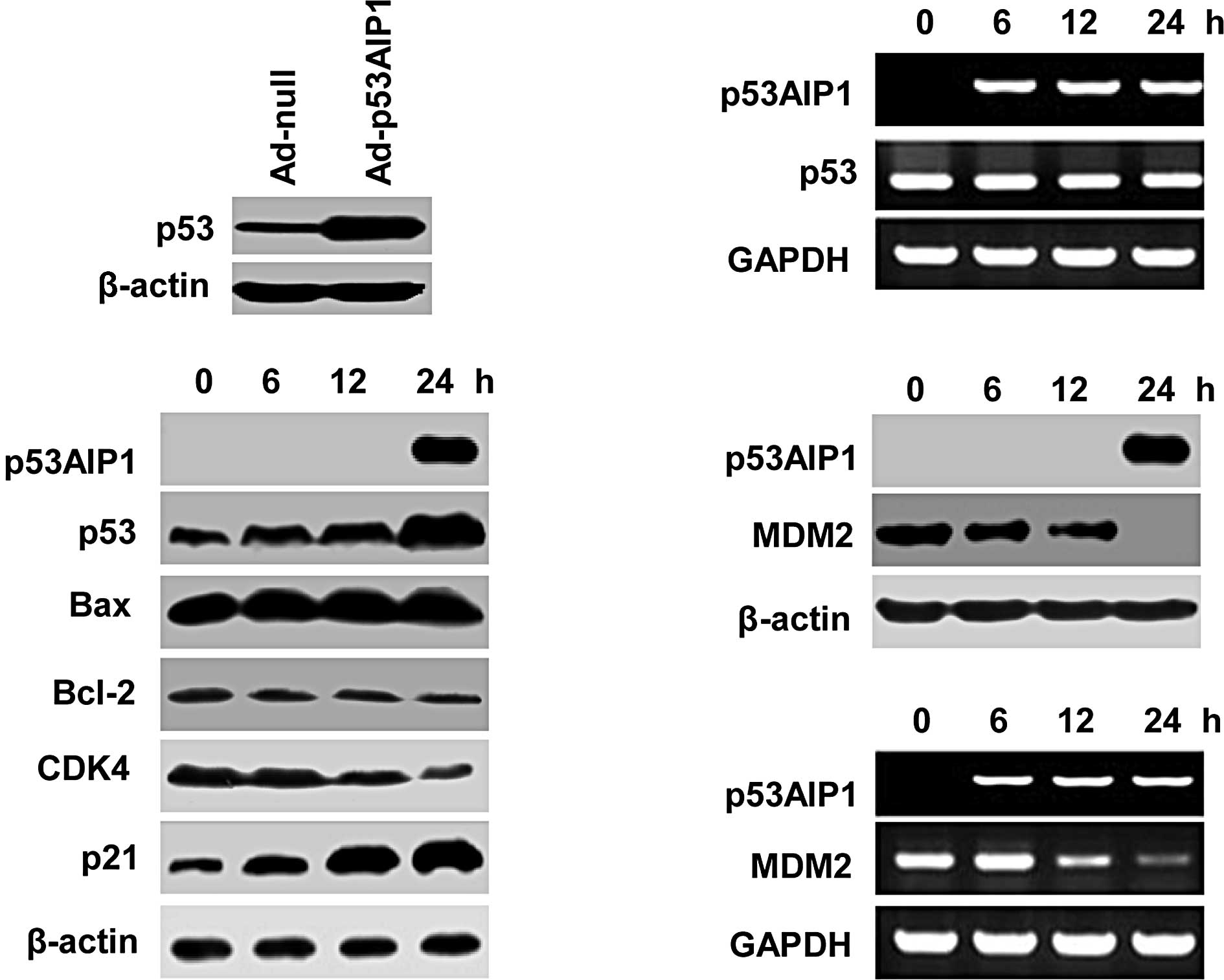 In this study, we generated Ad-p53AIP1 and established in vitro and in vivo models to evaluate Ad-p53AIP1-induced tumor inhibition. We characterized Ad-p53AIP1-induced apoptosis and cell cycle arrest in HepG2, HeLa and 4T1 cells. Our data demonstrated that p53AIP1-induced up-regulation of p53 through MDM2 down-regulation is an important mechanism underlying Ad-p53AIP1-induced apoptosis and cell cycle arrest.