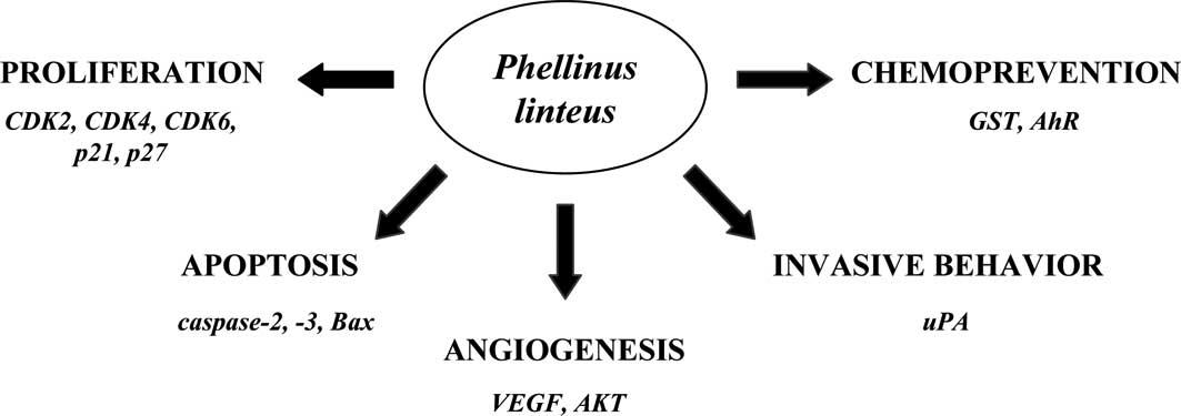 We recently demonstrated that PL inhibited proliferation and colony formation of highly invasive human breast cancer MDA-MB-231 cells (35). This effect was mediated by cell cycle arrest at the S phase through the up-regulation of expression of cyclin-dependent kinase inhibitor p27. PL also suppressed invasive behavior of MDA-MB-231 cells by the inhibition of cell adhesion, cell migration and cell invasion through the suppression of secretion of uPA (35). Moreover, PL significantly inhibited capillary morphogenesis of human aortic endothelial cells through the down-regulation of secretion of vascular endothelial growth factor from MDA-MB-231 cells. Thus, the inhibition of angiogenesis by PL was mediated by the suppression of the serine-threonine kinase AKT in breast cancer cells (35). Finally, extracts from P. linteus mycelia (PL-1 and PL-2) suppressed the activation of the aryl hydrocarbon receptor (AhR), the receptor activated by environmental pollutants and halogenated and polycyclic hydrocarbons, resulting in AhR-dependent gene expression (36). PL-1 also suppressed AhR-dependent gene expression triggered by cigarette smoke, suggesting the use of P. linteous for prevention of pathologies associated with aberrant activation of AhR, including smoking-associated diseases (36). In summary, a variety of P. linteus extracts demonstrated inhibitory activity against signaling pathways leading to the development and progression of cancer. Although some of these extracts were only partially characterized, these studies are important, since they reflect the use of extracts in traditional Oriental medicine.