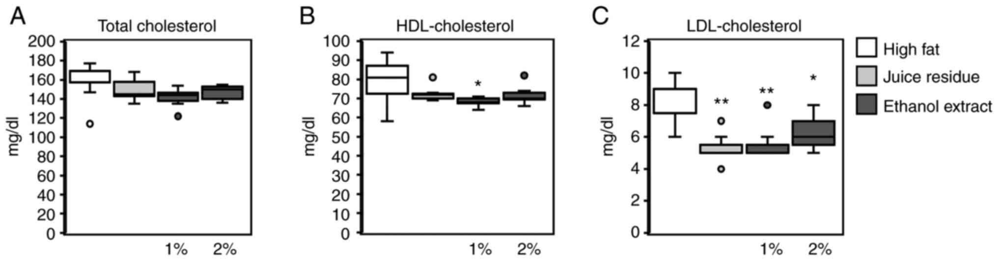Dyslipidemia, such as hyper-LDL cholesterolemia and hypertriglyceridemia, is one of the health issues associated with obesity and leads to arteriosclerosis. Takahashi et al (12) previously reported that a 4-week feeding period with 1.7% aronia phytochemicals (i.e., 0.4% anthocyanins) suppressed visceral fat accumulation in mice fed a high-fat diet. Furthermore, this treatment decreased serum LDL cholesterol and glucose levels (12). In the present study, supplementation with aronia juice residue or its ethanol extract did not affect visceral fat accumulation or blood glucose levels; however, the results of the present are consistent with those of the study by Takahashi et al (12) in terms of the LDL cholesterol reduction as a result of aronia supplementation. Moreover, Valcheva-Kuzmanova et al (22) reported that the administration of aronia fruit juice suppressed the plasma total cholesterol, LDL cholesterol and triglyceride levels. As indicated by serum triglyceride and LDL cholesterol levels, these parameters may be improved by common components of aronia juice and its residue (i.e., anthocyanins and carotenoids). Furthermore, aronia juice residue contains a considerable amount of mainly insoluble dietary fibers (23). A previous study found that the insoluble, fiber-rich fraction of carrot pomace lowered serum triglyceride and total cholesterol levels in hamsters (24). The aronia juice residue used in the present study contained anthocyanin and carbohydrate (429.1 mg and 73.2 g in 100 g dry matter, respectively). The present study did not determine the dietary fiber content in aronia juice residue; however, a previous study demonstrated that dietary fiber accounted for approximately 40% of carbohydrate in aronia fruit (25). Therefore, the observed improvement in lipid metabolism in the present study may have occurred due to the combined effects of the functional components of aronia juice residue, such as anthocyanin and dietary fibers.