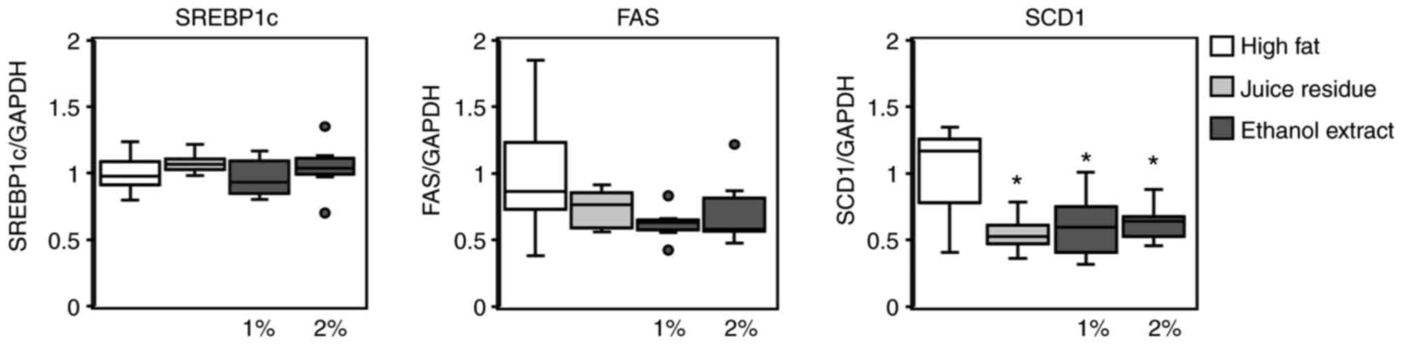 Male C57BL/6J mice (4 weeks old, 28 mice, 15.5 g average body weight) were purchased from Charles River Laboratories Japan, Inc. The mice were housed individually in plastic cages (13.6x20.8x11.5 cm) under controlled temperature (23±1˚C), humidity (45-60%), and a 12/12-h light and dark cycle, with lights on at 8:00 a.m.; the experimental animals were allowed free access to water and the respective diet throughout the experimental period. The basal diet contained 7% soybean oil based on the American Institute of Nutrition (AIN-93G) composition (20). Following a 1-week acclimation on the basal diet, the mice were assigned into 4 experimental groups (7 mice per group) depending on the different diets given (Table I) as follows: i) The high-fat diet group; ii) high-fat diet with 2% aronia juice residue; iii) high-fat diet with 1% aronia ethanol extract; and iv) high-fat diet with 2% aronia ethanol extract group. The mice were fed their respective diets for 26 days, and were then sacrificed under anesthesia (diethyl ether; 1.9% diethyl ether for inhalant anesthesia in a glass container) following 12 h of fasting (9:00 a.m., light period). After a terminal blood sample was collected into a blood collection tube (BD Vacutainer, BD Biosciences), the liver, epididymal, mesenteric, perirenal, retroperitoneal and inguinal white adipose tissues (WATs) were immediately excised and weighed. A specimen of liver tissue was conserved in RNAlater® (Sigma-Aldrich; Merck KGaA) for use in reverse transcription-quantitative polymerase chain reaction (PCR) analysis. The animal experiments were approved by the Ethical Committee of Experimental Animal Care at Hokkaido University (Permission no. 09-0094).