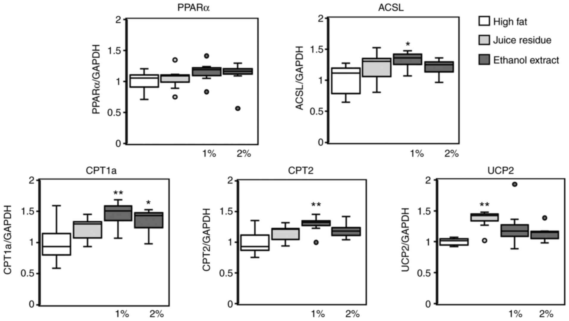 To further investigate the effects of aronia juice residue and its ethanol extract on lipid metabolism, the hepatic expression levels of genes involved in lipid synthesis and degradation were measured. As shown in Fig. 4, the hepatic mRNA levels of genes implicated in lipogenesis (i.e., SREBP-1c, FAS and SCD1) were determined. SREBP-1c expression was not affected by the administration of aronia juice residue or ethanol extract (Fig. 4). By contrast, the FAS and SCD1 mRNA levels were decreased in mice fed the aronia juice residue or its ethanol extract compared to the mice fed the high-fat diet, although the differences in FAS expression were not significant (Fig. 4). In addition, the hepatic expression levels of genes associated with lipolysis were measured (Fig. 5). The PPARα mRNA levels did not differ significantly among the 4 experimental groups. However, the expression of ACSL, CPT1a and CPT2 was significantly upregulated in the mice fed the 1% aronia ethanol extract compared to the mice fed the high-fat diet (Fig. 5). Of note, CPT1a was the only gene whose expression was significantly increased in the mice fed the 2% ethanol extract. Moreover, UCP2 expression was significantly upregulated in the mice fed the aronia juice residue compared to the mice fed the high-fat diet (Fig. 5).