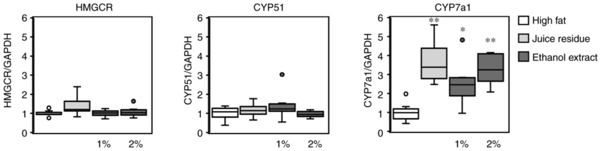 To determine the cause of the observed decrease in serum LDL cholesterol levels in mice fed the aronia juice residue or its ethanol extract, the hepatic mRNA levels of genes involved in cholesterol metabolism were measured. As shown in Fig. 6, the expression levels of HMG-CoA reductase and CYP51, which are involved in cholesterol synthesis, were not significantly affected by the inclusion of aronia in the diet (Fig. 6). On the contrary, the mRNA levels of CYP7A1, which is a rate-limiting enzyme in the hepatic catabolism of cholesterol into bile acid, were markedly and significantly increased with the inclusion of aronia juice residue (3.7-fold) and 1% or 2% ethanol extract (2.5- or 3.3-fold, respectively) in the diet compared to the high-fat diet.