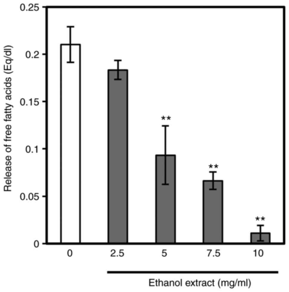 Subsequently, to investigate whether aronia ethanol extract affects triglyceride absorption, the inhibition of lipase activity in vitro was evaluated (Fig. 7). Ethanol extract of aronia juice residue lowered the release of free fatty acids from triolein in a dose-dependent manner with significant decreases observed at the 5, 7.5 and 10 mg/ml concentrations. The IC50 value for pancreatic lipase was 4.6 mg/ml ethanol extract.