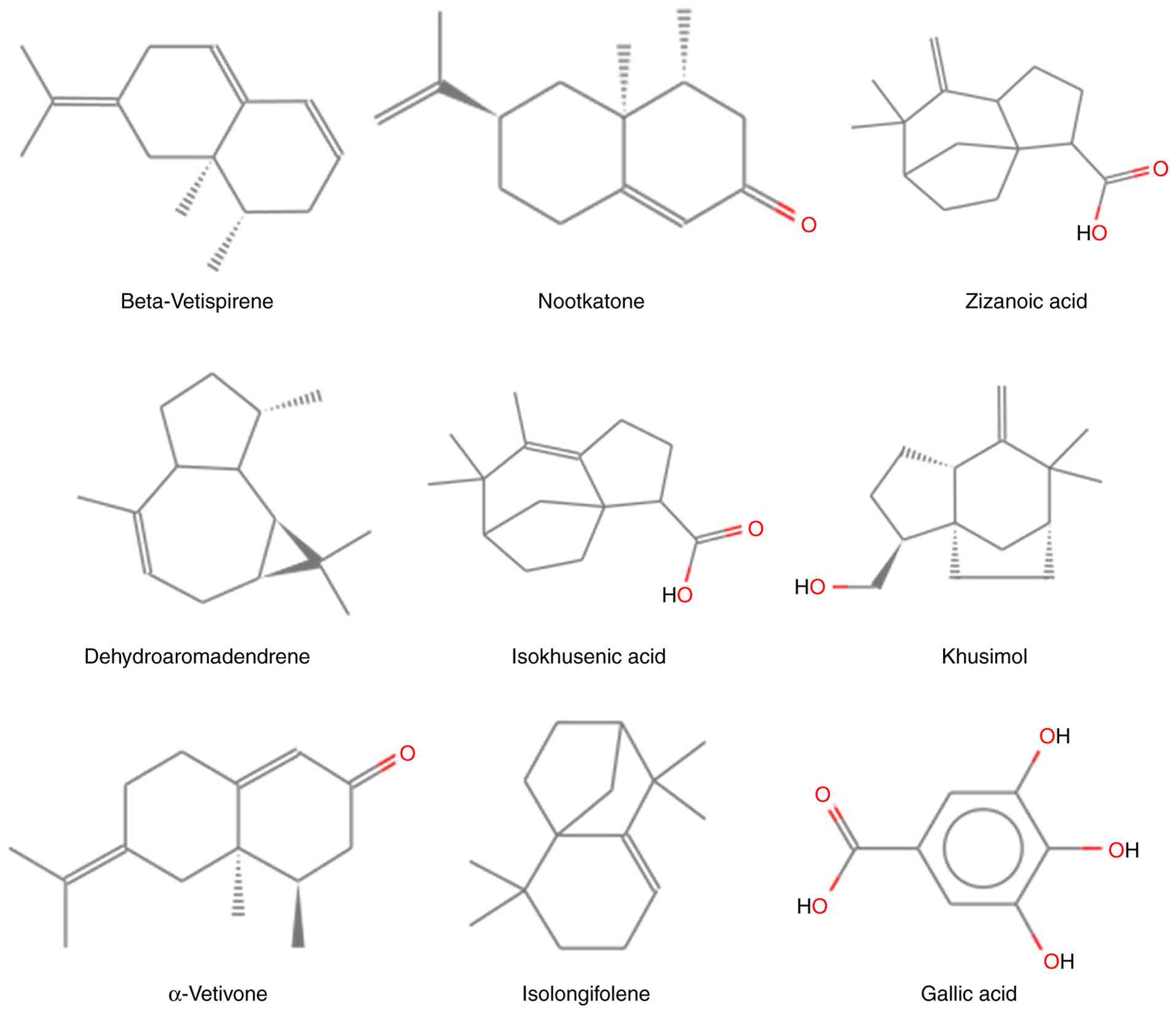 Vetiver exhibits a strong affinity for AKR1C1(15), an antioxidant enzyme critical for a number of cellular mechanisms and implicated in several diseases, particularly cancer (22). It is known that reactive oxygen species (ROS) contribute to lung carcinogenesis; however, at the same time, they can also kill cancer cells (23). AKR1C1 can eliminate intracellular ROS (ROS is overexpressed in lung cancer) rendering AKR1C1 a potential therapeutic target (15). However, its structural similarity to AKR1C2 presents selectivity challenges. A previous study investigated vetiver as a selective AKR1C1 ligand for lung cancer co-therapy (15). Gas chromatography-mass spectrometry (GC-MS) identified 354 vetiver-derived compounds (15), which were analyzed using KNIME and molecular docking; β-vetispirene (Fig. 3) demonstrated the strongest AKR1C1 binding affinity (-15.12 kcal/mol), surpassing the native ligand and acetylsalicylic acid. These findings highlight the potential of vetiver as a selective co-chemotherapeutic agent. However, as that study was mainly based on bioinformatics, machine learning, and molecular docking approaches without any in vitro or in vivo experimental validation, findings remain predictive and require biological and clinical confirmation to establish real anticancer efficacy (15). In addition to this, Chitra et al (24) reported that an aqueous extract of vetiver root had marked anticancer potential. Vetiver exhibited in vitro cytotoxicity against MCF-7 human breast cancer cell line, using 3-(4,5-dimethyl thiazolyl-2-yl)-2, 5-diphenyl tetrazolium bromide (MTT) and assessment of cell morphology by using acridine orange and ethidium bromide staining, at an IC50 concentration of 5 to 50 µg/ml. The maximum inhibition of concentration was at 31 to 37 µg/ml at 24 and 48 h, respectively. That study was limited to an in vitro MTT assay using a single breast cancer cell line (MCF-7) without testing on normal cells or additional cancer models. Additionally, there was no effort to isolate and identify any phytoconstituents which limits conclusions about the specific anticancer constituents and their mode of action (24).