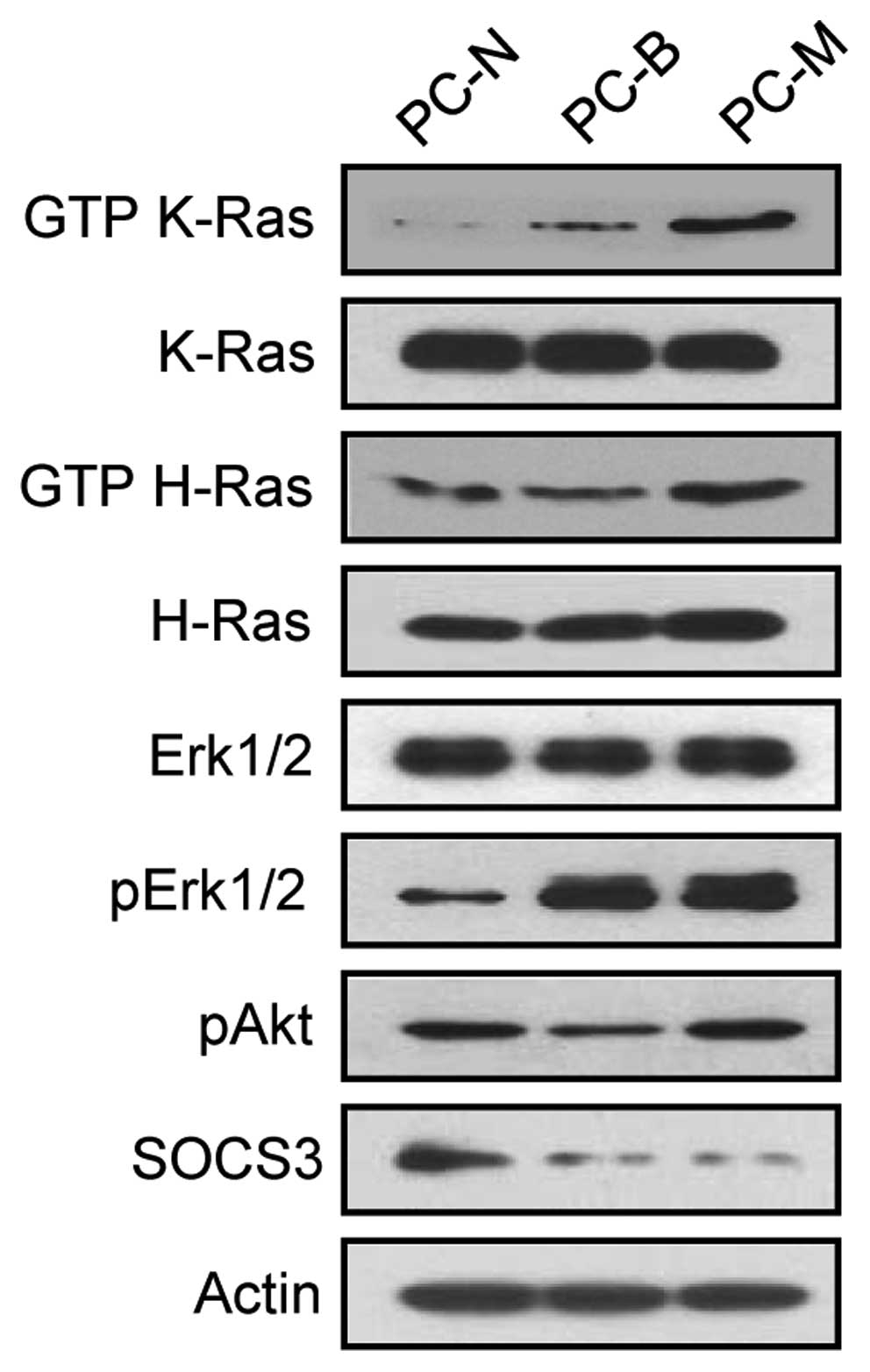 Cultured cells were lysed in RIPA buffer (150 mM NaCl, 1% Nonidet P-40, 0.5% sodium deoxycholate, 0.1% SDS, and 50 mM Tris buffer, pH 8.0). Proteins were heated at 95°C for 5 min and analyzed by SDS-PAGE on 8–12% polyacrylamide gels. The proteins were electroblotted onto a PVDF membrane (Millipore). The membrane blots were blocked with 5% (w/v) nonfat dried milk, incubated with primary and secondary antibodies, and then were visualized by the ECL western blotting detection system (WEST-ZOL plus; Intron Biotechnology, Korea). The following antibodies were used: anti-Bcl-xL, anti-caspase-3 anti-Bcl-2, anti-Bax, anti-phosphorylated Akt, anti-Erk1/2, anti-phosphorylated Erk1/2, and anti-Ras antibodies (Cell Signaling Technology); anti-p120RasGAP (BD Transduction Laboratories); anti-neurofibromin, anti-actin, anti-p53, anti-Mcl-1, anti-K-Ras, anti-H-Ras, anti-SOCS3, HRP-conjugated goat anti-rabbit IgG and HRP-conjugated goat anti-mouse IgG antibodies (Santa Cruz Biotechnology, Inc.).