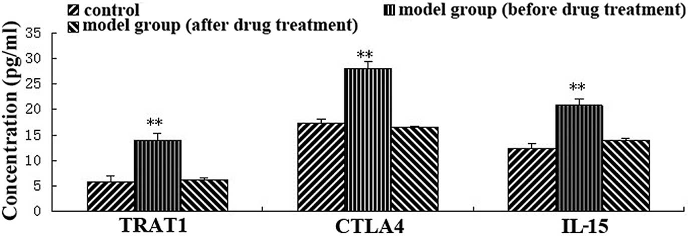 As shown in Fig. 2, the expression of TRAT1, CTLA4 and IL-15 in the model group before drug treatment were 1.6, 1.5, 1.5-fold of the control group, which was consistent with the screening results of differentially expressed genes (P<0.05). However, the expression of these genes were restored to normal levels after drug treatment, confirming that overexpression of these genes are associated with the occurrence of AS.