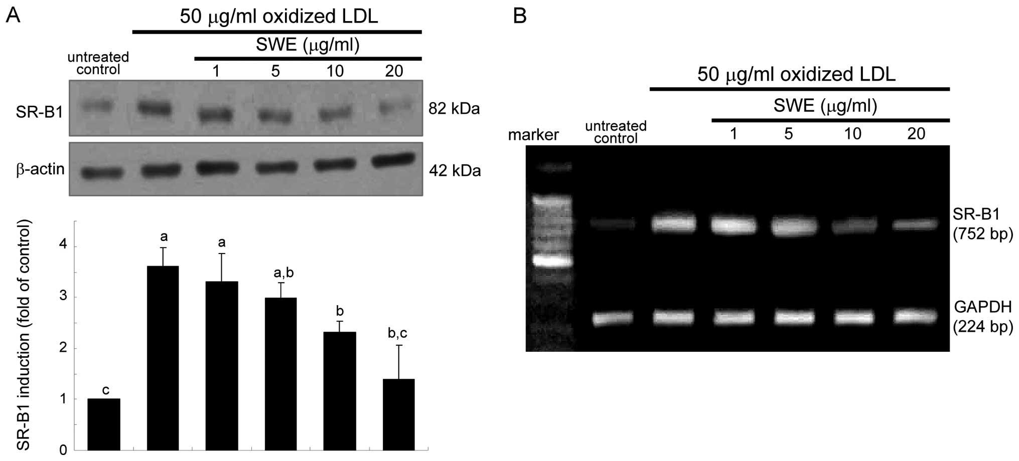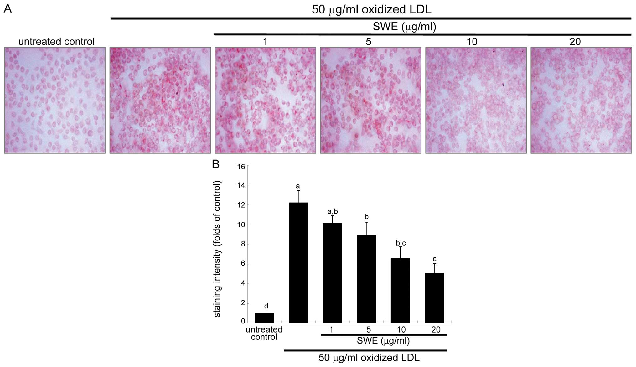 This study examined intracellular lipid accumulation in macrophages by using oil red O staining. There was strong reddish staining observed in macrophages exposed to 50 μg/ml oxidized LDL for 18 h. This indicates cellular accumulation of lipids through the upregulated SR-B1. When ≥5 μg/ml SWE was applied to macrophages for 18 h, reddish lipid droplets disappeared (Fig. 2). Accordingly, SWE delayed foam cell formation in macrophages exposed to 50 μg/ml oxidized LDL.