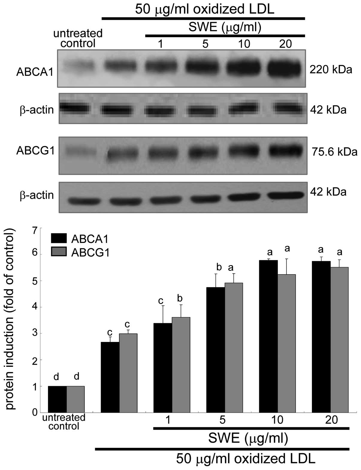 SWE boosted the induction of ABCA1 and ABCG1 proteins at the transcriptional levels (Fig. 3). Consistently, cholesterol efflux was enhanced in oxidized LDL-treated macrophages (Fig. 5B). The efflux was further accelerated in macrophages exposed to 50 μg/ml oxidized LDL and treated with ≥10 μg/ml SWE (Fig. 5B). In addition, the HDL formation was enhanced at levels of protein in lipid-laden macrophages treated with oxidized LDL, which was further highly enhanced by 20 μg/ml SWE (Fig. 5C).