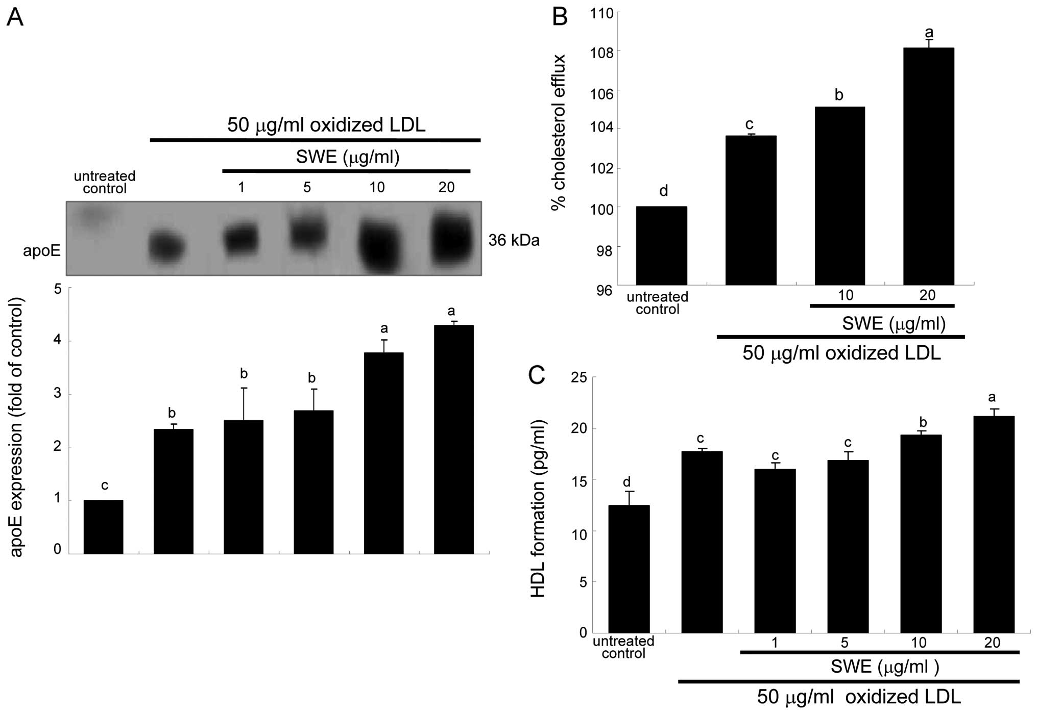 ApoE is essential for the normal catabolism of triglyceride-rich lipoprotein constituents. There are numerous studies in regard of apoE-mediated cholesterol efflux. Cholesterol efflux from macrophages to apoE diminishes foam cell formation and prevents atherosclerosis (9,10). However, very little is known about the apoE activity related to cholesterol transporters. Several membrane transporters related to cholesterol efflux include ABCA1, ABCG1, SR-B1 and caveolin-1 (27). A recent study showed that apoE is involved in cholesterol efflux in macrophages by upregulating ABCA1 expression (10). This study showed that SWE was an apoE promoter enhancing its secretion in oxidized LDL-loaded macrophages. This may be an athero-protective mechanism by which SWE boosted ABCA1 expression and cholesterol efflux. Conversely, epigallocatechin-3-gallate attenuated downregulated ABCA1 and decreased cholesterol efflux to apoA1 in TNF-α-exposed macrophage foam cells (28).