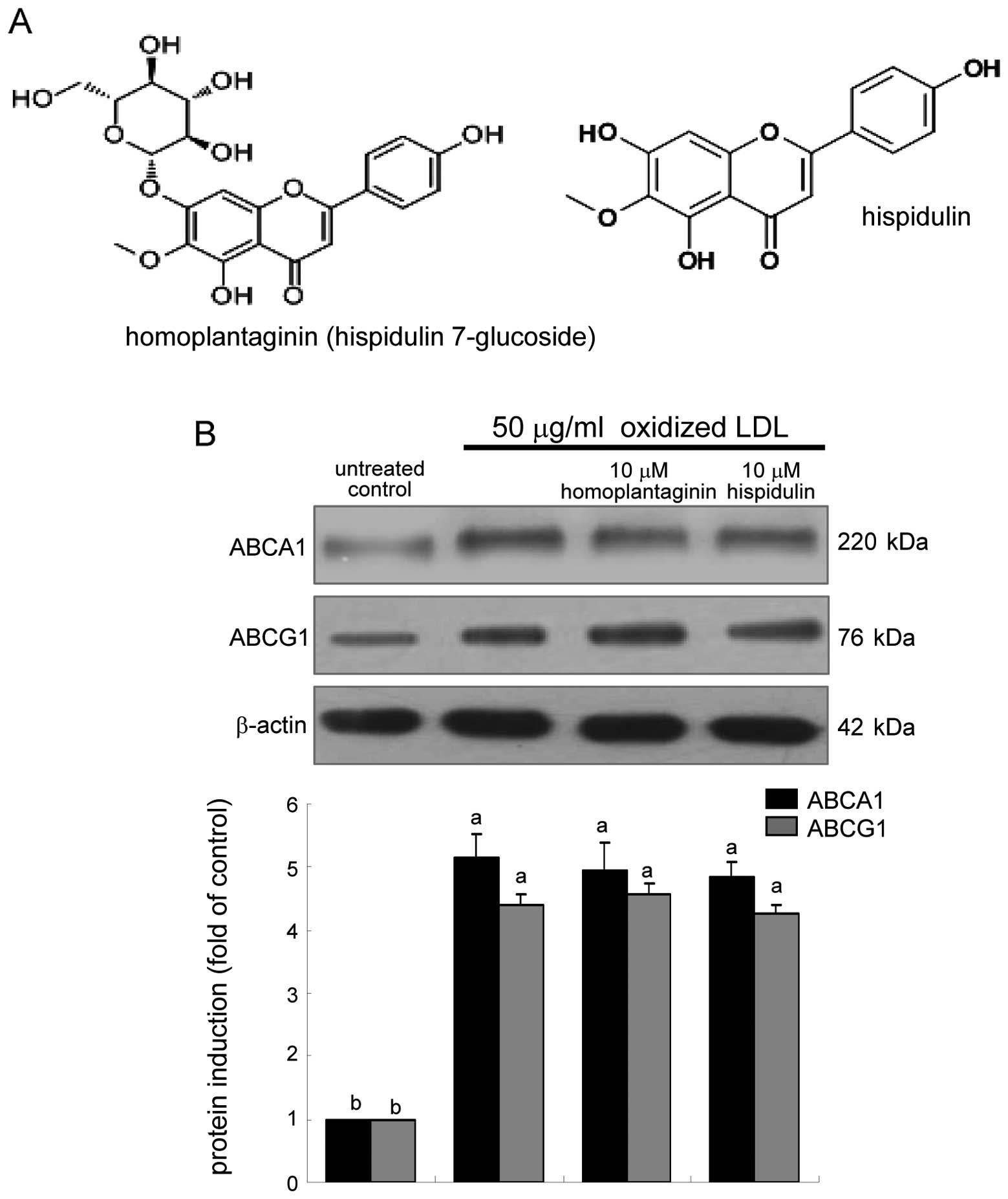 Dulbecco’s modified Eagle’s medium (DMEM)chemicals, fatty acid-free bovine serum albumin (BSA) and Oil red O were provided by Sigma-Aldrich Chemical (St. Louis, MO), as were all other reagents, unless specifically stated otherwise. Fetal bovine serum and penicillin-streptomycin were obtained from Lonza (Walkersville, MD). SR-B1 antibody was supplied by Santa Cruz Biotechnology (Santa Cruz, CA). ABCA1 and ABCG1 antibodies were purchased from Novus Biologicals (Littleton, CO). Apolipoprotein (apo) E antibody was obtained from Abcam (Cambridge, UK). β-actin antibody was provided from Sigma Chemicals. Horseradish peroxidase-conjugated goat anti-rabbit IgG and rabbit anti-mouse IgG were supplied by Jackson Immuno Research Laboratory (West Grove, PA). Homoplantaginin and hispidulin were supplied by Shanghai Tauto Biotech Co., Ltd. (Shanghai, China).