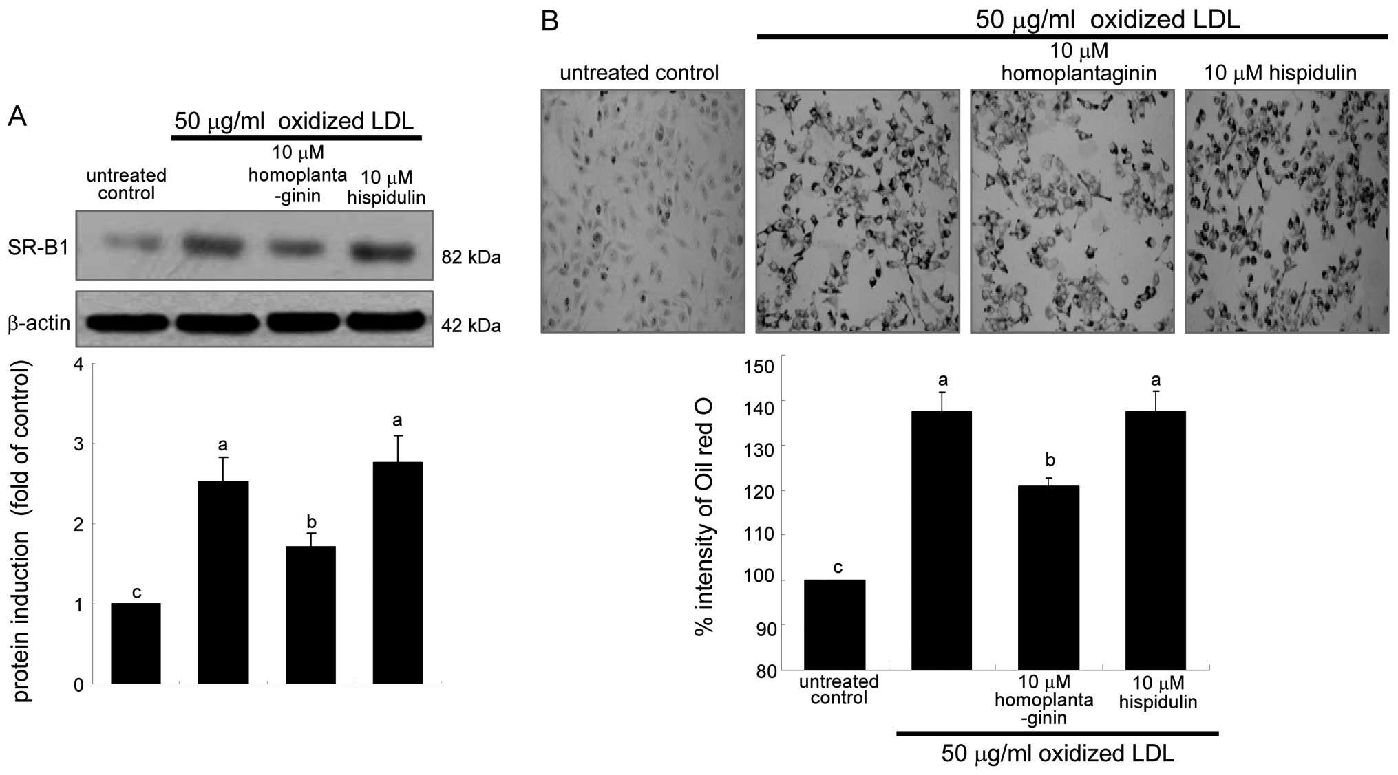 The SWE application to oxidized LDL-treated macrophages upregulated the cellular expression of ABCA1 and ABCG1 (Fig. 3). This study elucidated whether homoplantaginin and hispidulin, the single compounds present in sage weeds (Fig. 6A), influenced cholesterol efflux from lipid-laden foam cells. Homoplantaginin and hispidulin did not modulate the cellular expression of ABCA1 and ABCG1 upregulated in oxidized LDL-exposed macrophages (Fig. 6B). In contrast, 10 μM homoplantaginin, but not hispidulin inhibited SR-B1 induction and consequent uptake of oxidized LDL in J774A.1 macrophages (Fig. 7). These results indicate that SWE containing homoplantaginin retarded foam cell formation as an anti-atherogenic agent.