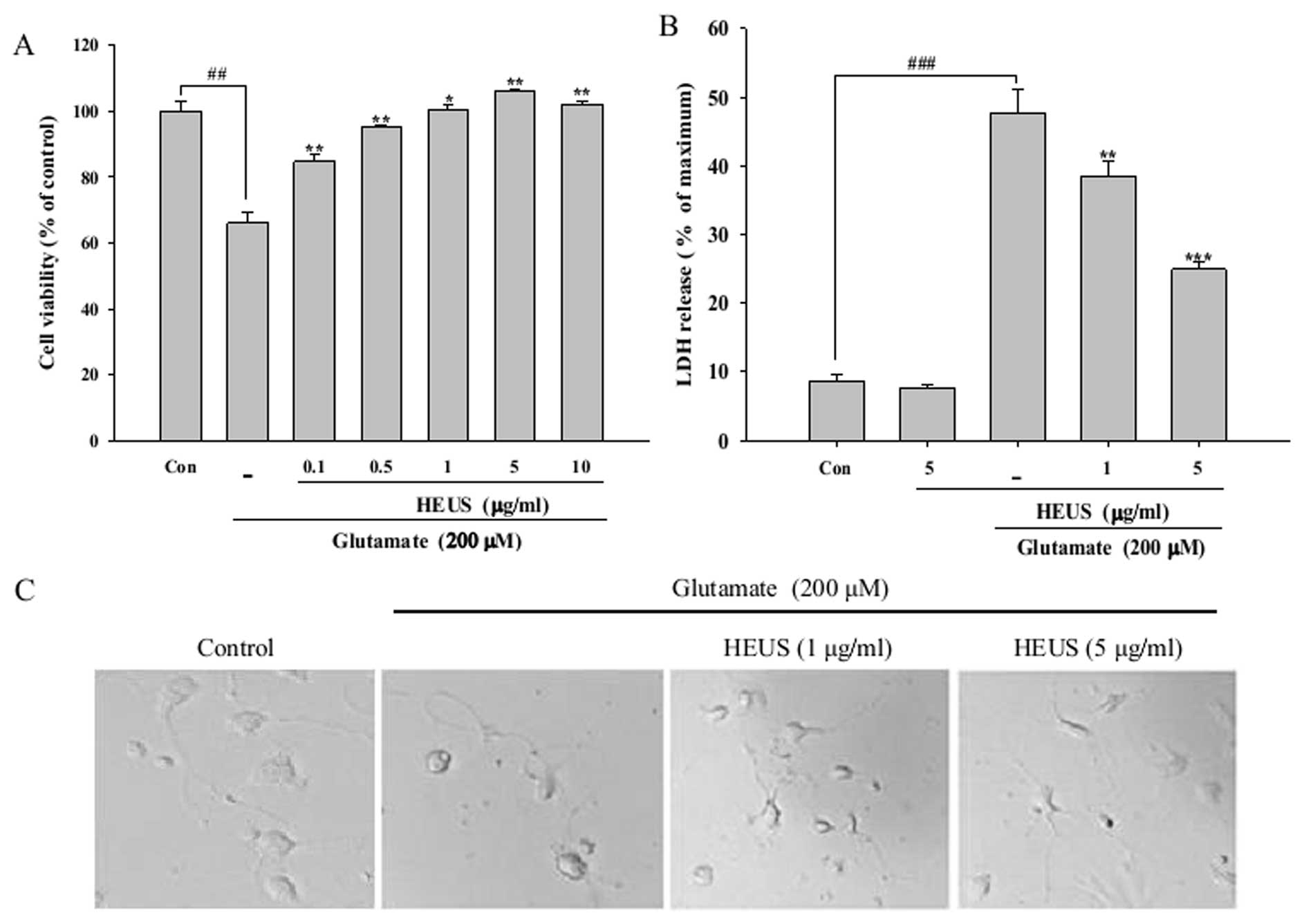In order to determine whether HEUS is protective against glutamate-induced toxicity, cell viability was measured by MTT assay. Cortical neurons were pretreated with various concentrations of HEUS (0.1–10 μg) for 24 h, followed by exposure to glutamate at a concentration of 200 μM for a period of 6 h. Stimulation with glutamate alone resulted in reduced cell viability, ∼34% of that of the control, however, pretreatment with HEUS resulted in significantly reduced glutamate-induced toxicity in a dose-dependent manner (Fig. 1A). Next, the protective effects of HEUS were also estimated according to changes in the intracellular release of LDH. The level of LDH release showed a significant increase, to 47.6%, after exposure to glutamate, while treatment with HEUS resulted in a marked decrease in the release of LDH, to 38.4 and 24.9%, at a concentration of 1 and 5 μg/ml, respectively (Fig. 1B). The protective effects of HEUS were also confirmed by morphological observation using a phase-contrast microscope. Exposure to glutamate resulted in significant cell insult to the cortical neurons, including diminution of cellular processes and decrease in refraction; these morphological features showed marked recovery when cells were pretreated with 5 μg/ml of HEUS (Fig. 1C). These results indicated that pretreatment with HEUS can exert a protective effect against glutamate-induced toxicity in primary cortical neurons.